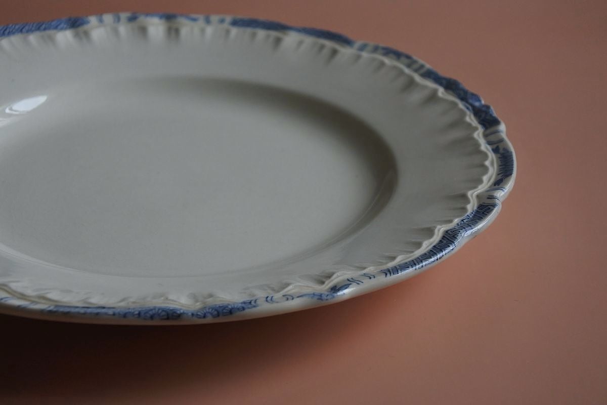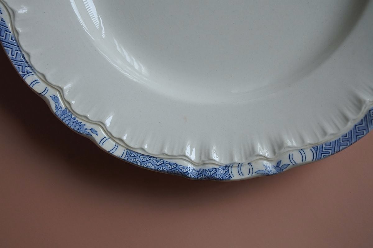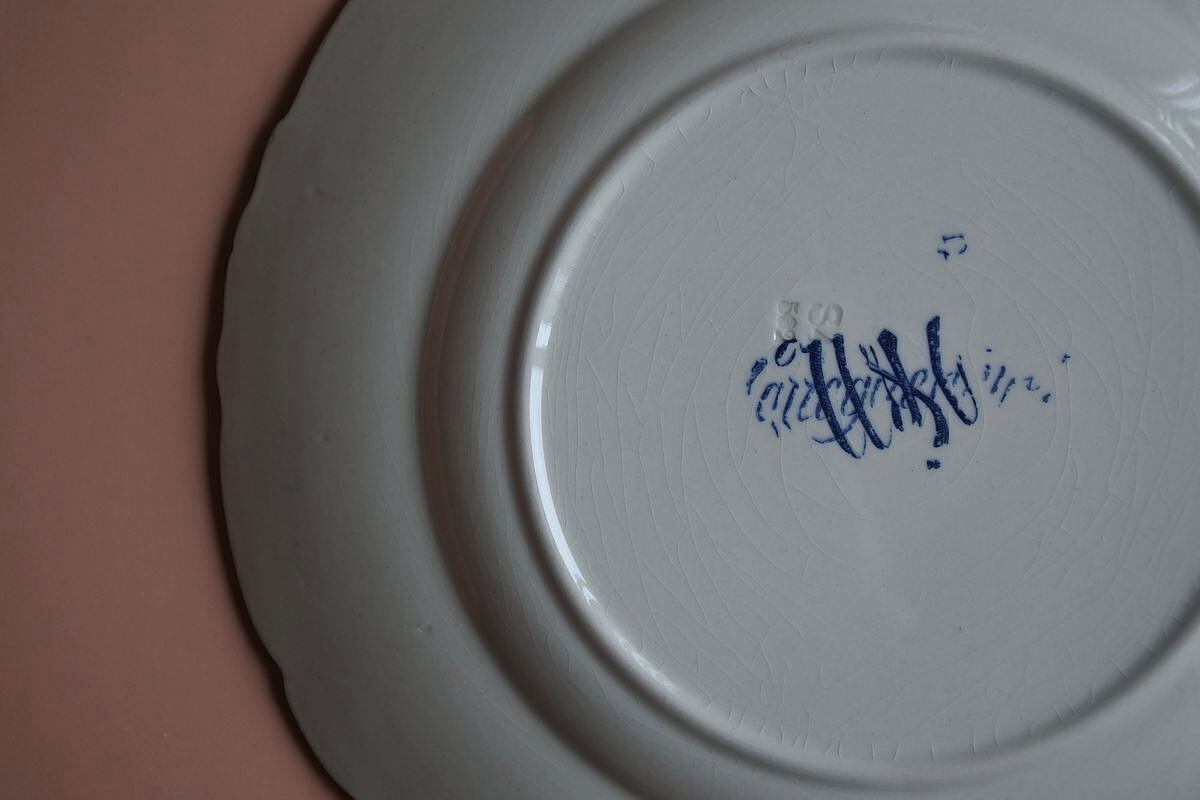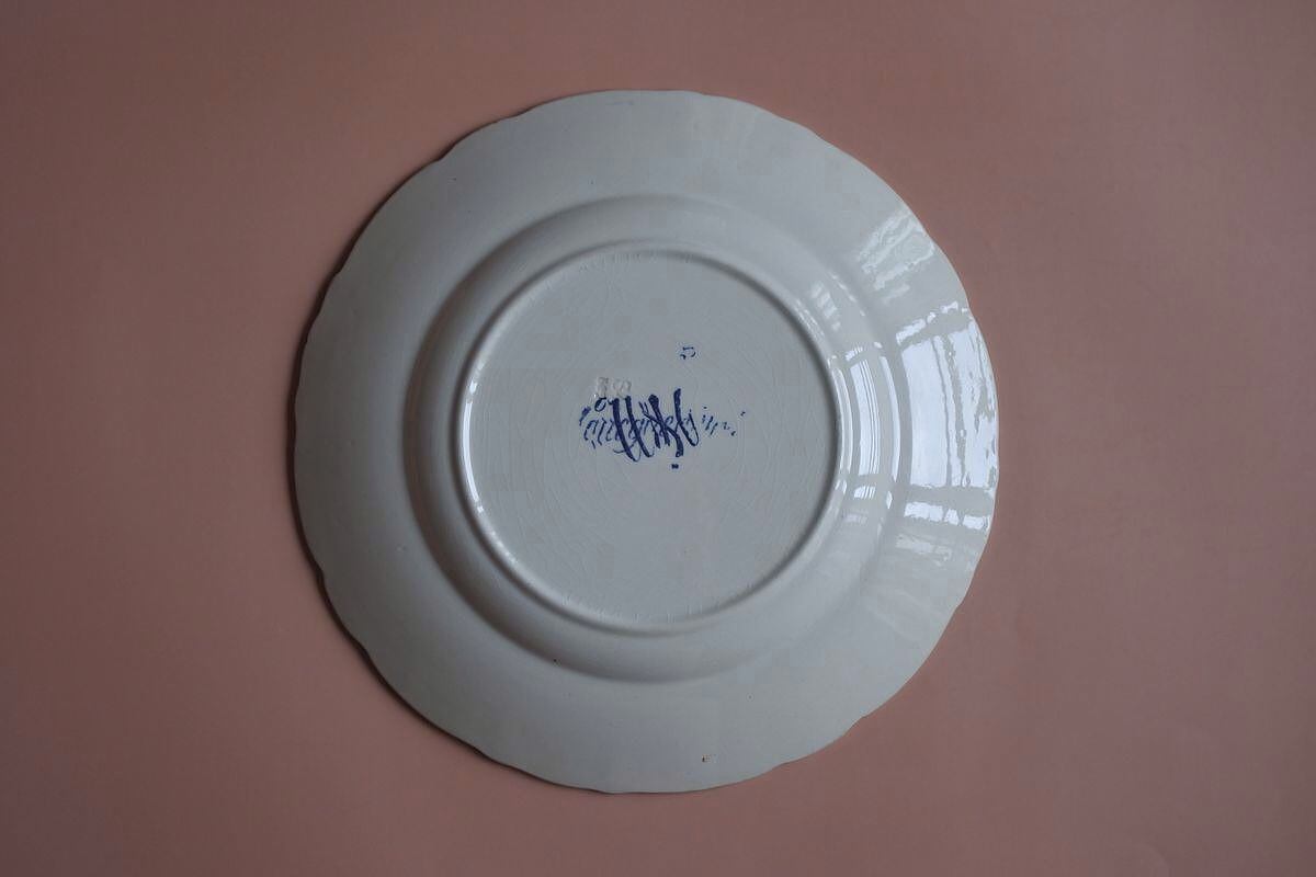 和柄で縁取られた花リム皿。19世紀終わり頃のSarreguemines(サルグミンヌ)窯の窯印があります。フランスでは万国博覧会後、日本趣味が流行していた時期です。やわらかな艶のある乳白色に、ちらりと覗くブルーの細やかな転写柄。控えめな華やかさと、可愛らしさが魅力です。和洋どちらの雰囲気も感じさせ、お箸や和食器との相性も良さそう。程よいサイズ感で、取り皿にも、ちょっとしたメイン用にも使用できます。お料理と一緒に、古い時代の異国情緒を楽しまれるのもいいかもしれません。