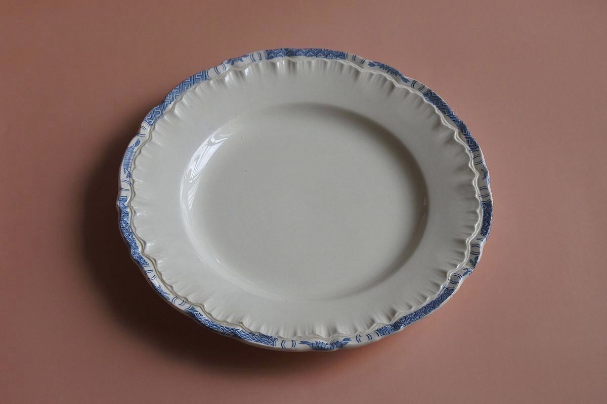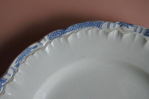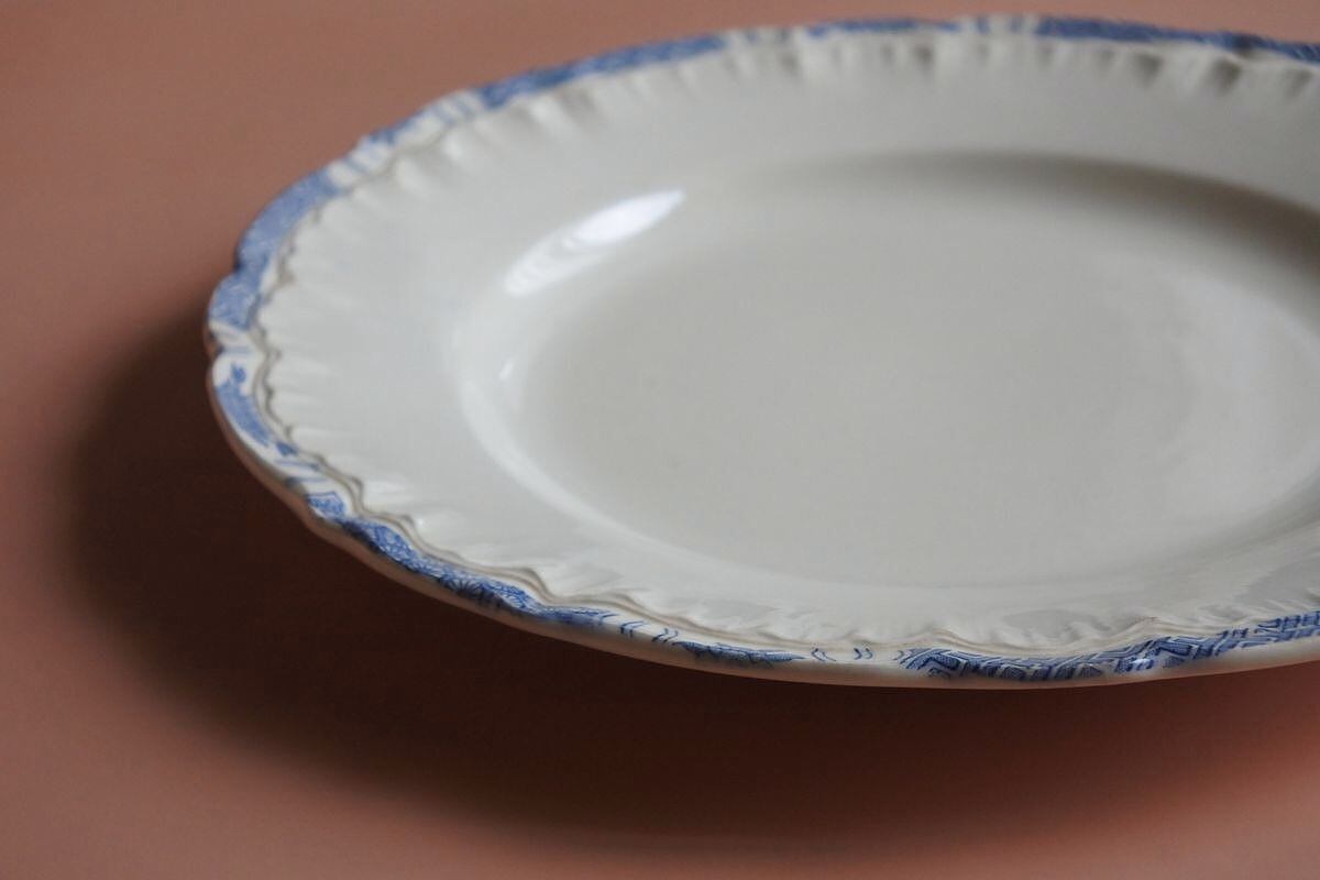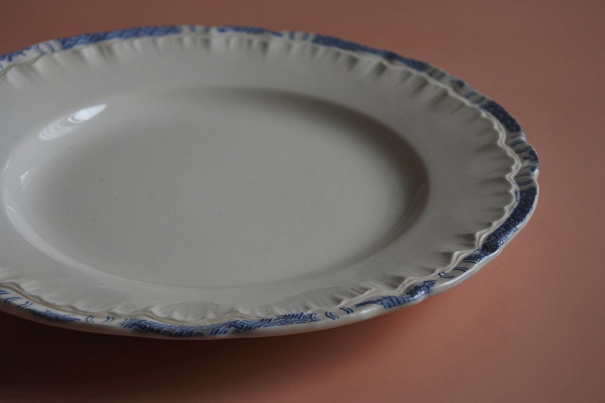 和柄で縁取られた花リム皿。19世紀終わり頃のSarreguemines(サルグミンヌ)窯の窯印があります。フランスでは万国博覧会後、日本趣味が流行していた時期です。やわらかな艶のある乳白色に、ちらりと覗くブルーの細やかな転写柄。控えめな華やかさと、可愛らしさが魅力的です。和洋どちらの雰囲気も感じさせ、お箸や和食器との相性も良さそう。程よいサイズ感で、取り皿にも、ちょっとしたメイン用にも使用できます。お料理と一緒に、古い時代の異国情緒を楽しまれるのもいいかもしれません。