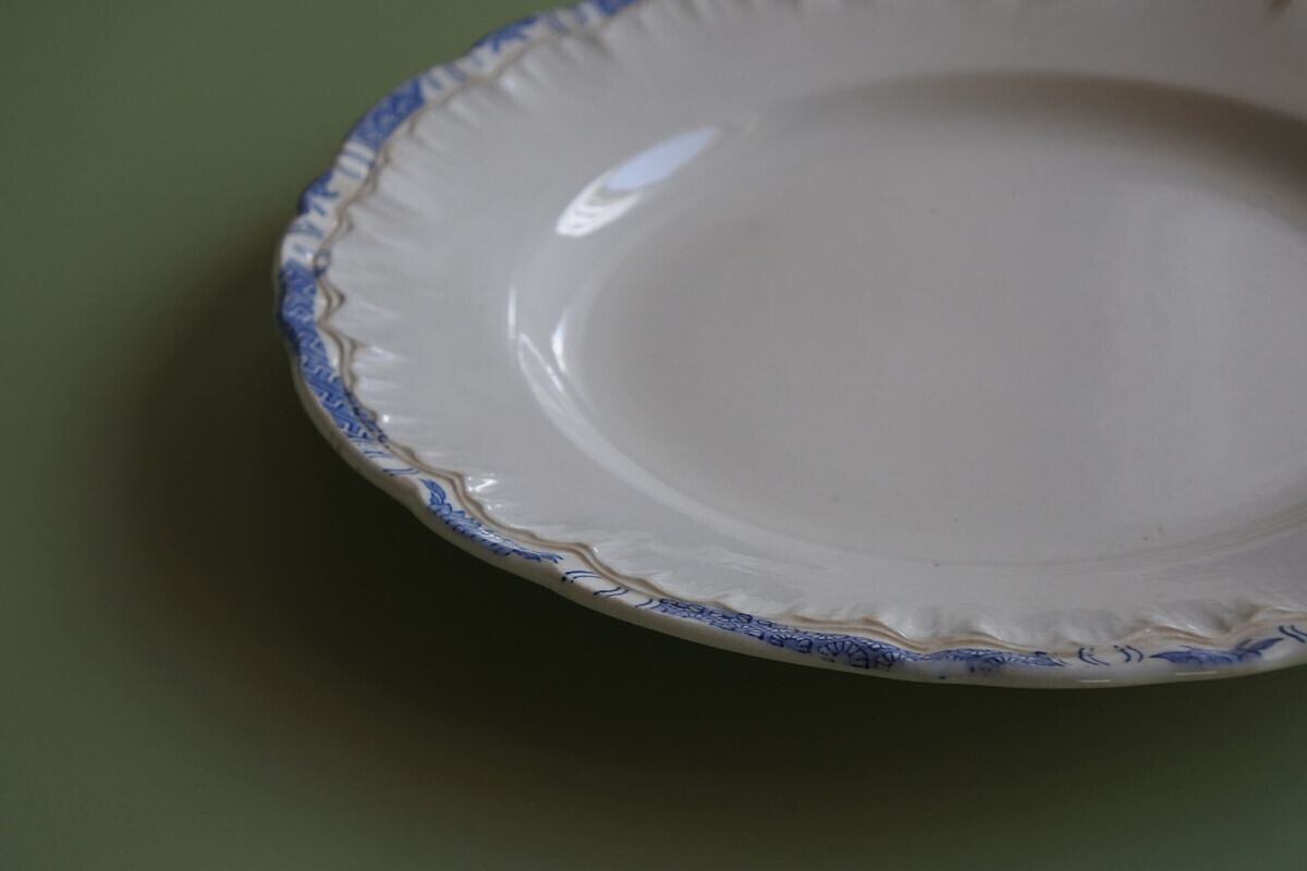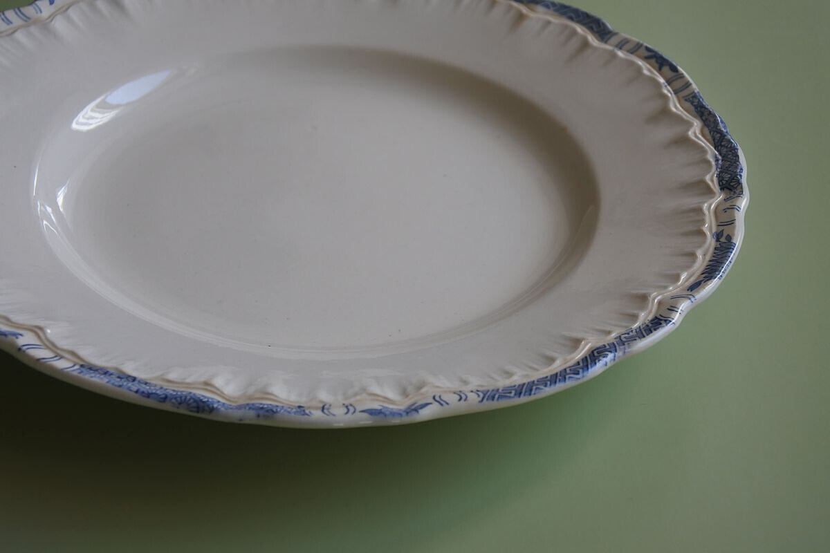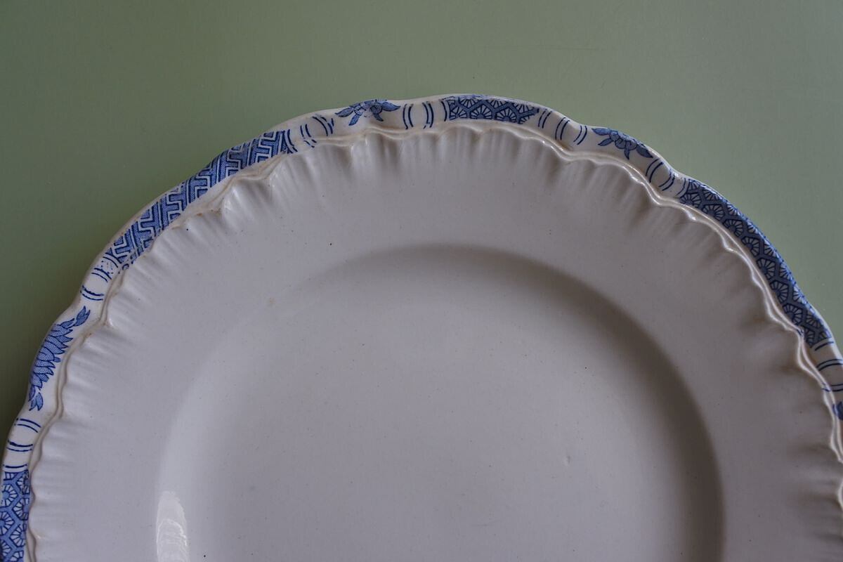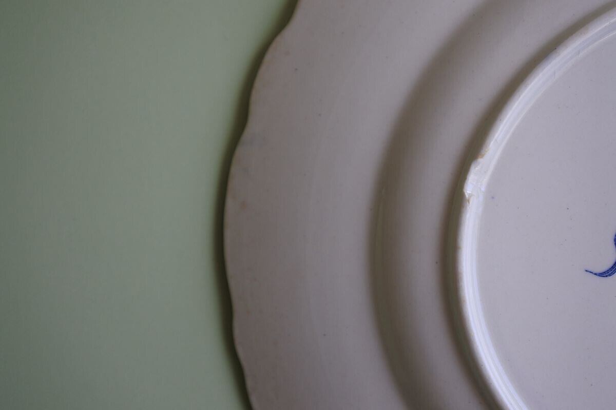 和柄で縁取られた花リム皿。19世紀終わり頃のSarreguemines(サルグミンヌ)窯の窯印があります。フランスでは万国博覧会後、日本趣味が流行していた時期です。やわらかな艶のある乳白色に、ちらりと覗くブルーの細やかな転写柄。控えめな華やかさと、可愛らしさが魅力です。和洋どちらの雰囲気も感じさせ、お箸や和食器との相性も良さそう。程よいサイズ感で、取り皿にも、ちょっとしたメイン用にも使用できます。年末年始のテーブルで、お料理と一緒に、古い時代の異国情緒を楽しまれるのもいいかもしれません。