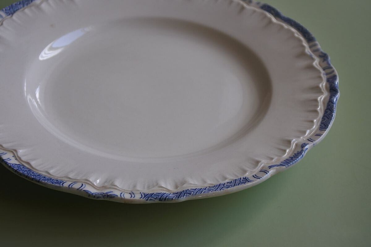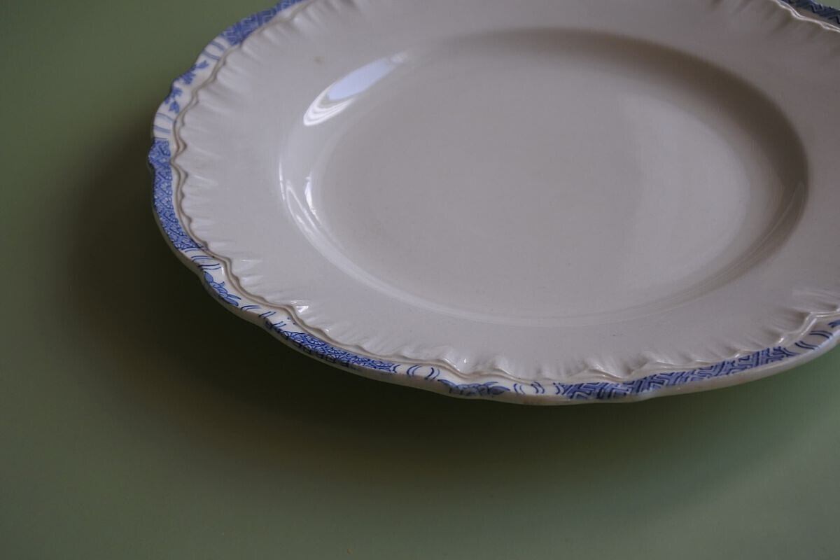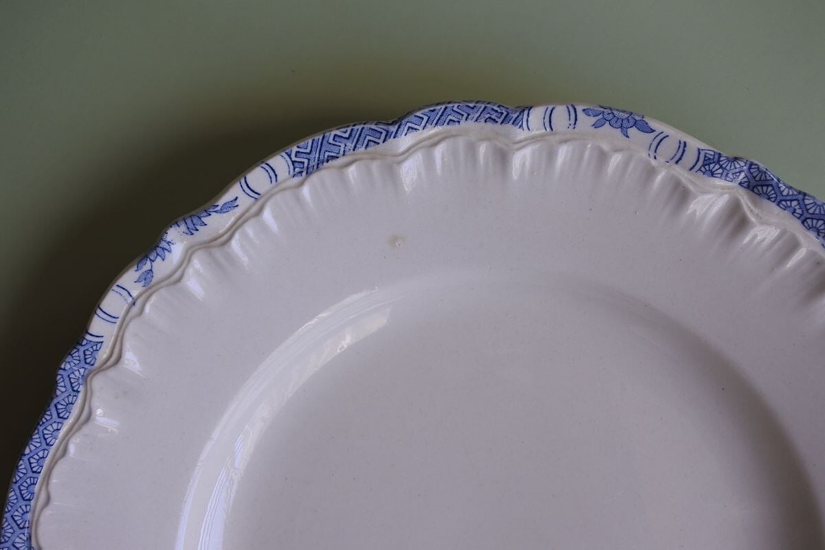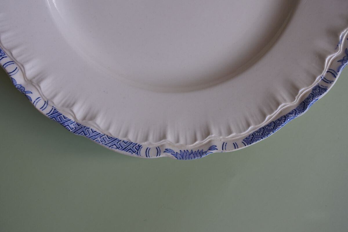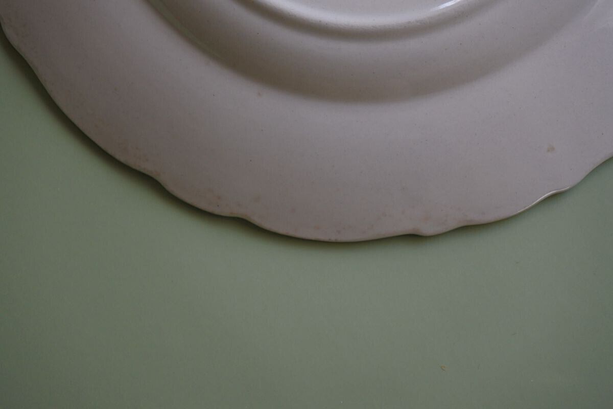 和柄で縁取られた花リム皿。19世紀終わり頃のSarreguemines(サルグミンヌ)窯の窯印があります。フランスでは万国博覧会後、日本趣味が流行していた時期です。やわらかな艶のある乳白色に、ちらりと覗くブルーの細やかな転写柄。控えめな華やかさと、可愛らしさが魅力です。和洋どちらの雰囲気も感じさせ、お箸や和食器との相性も良さそう。程よいサイズ感で、取り皿にも、ちょっとしたメイン用にも使用できます。年末年始のテーブルで、お料理と一緒に、古い時代の異国情緒を楽しまれるのもいいかもしれません。