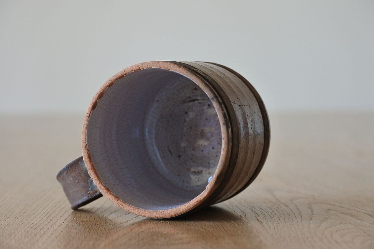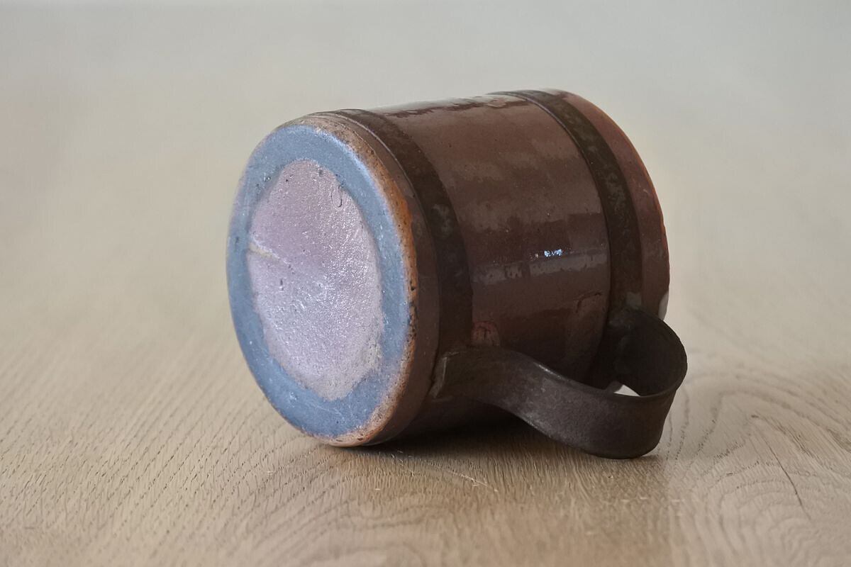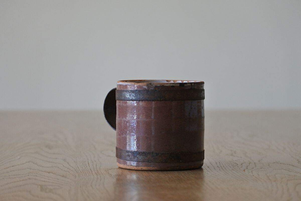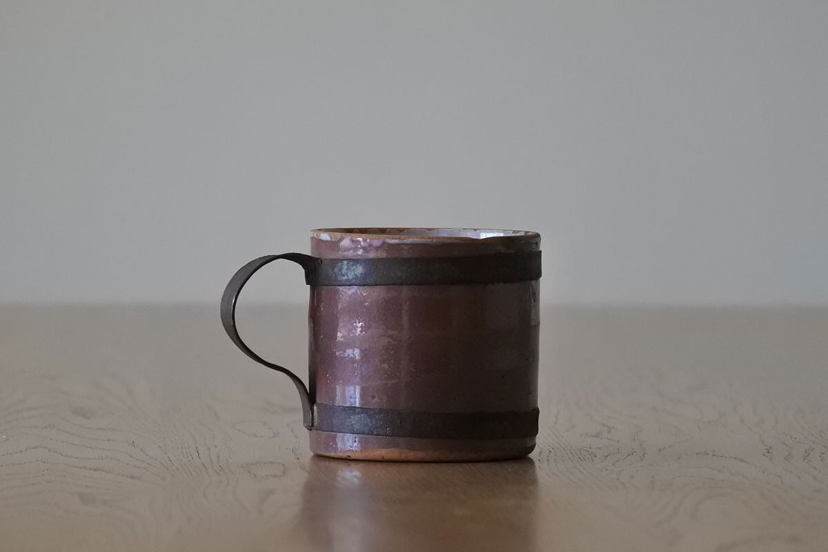 ココア色のキュノワール。フランス北部(ノルマンディ地方)で林檎の発泡酒などを飲む際に使用されていたマグカップです。鋼板で補修されたハンドルが、手仕事の素朴な温かさを感じさせます。シンプルなフォルムながら、異素材や色合いのコントラスト、細かな貫入のつくり出す表情にポエティックな味わいがあり、アート作品のような佇まい。傷みがあるため実用向きではありませんが、インテリアオブジェとして楽しんでいただければと思います。