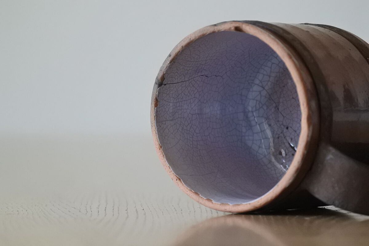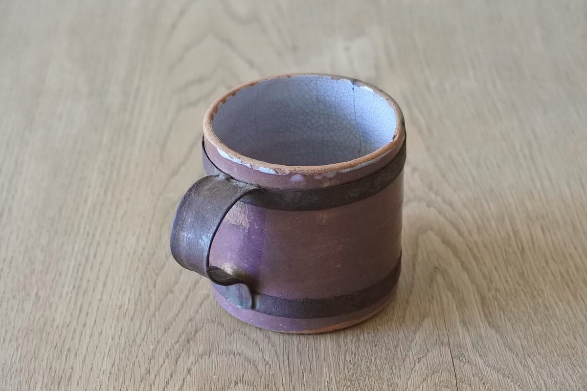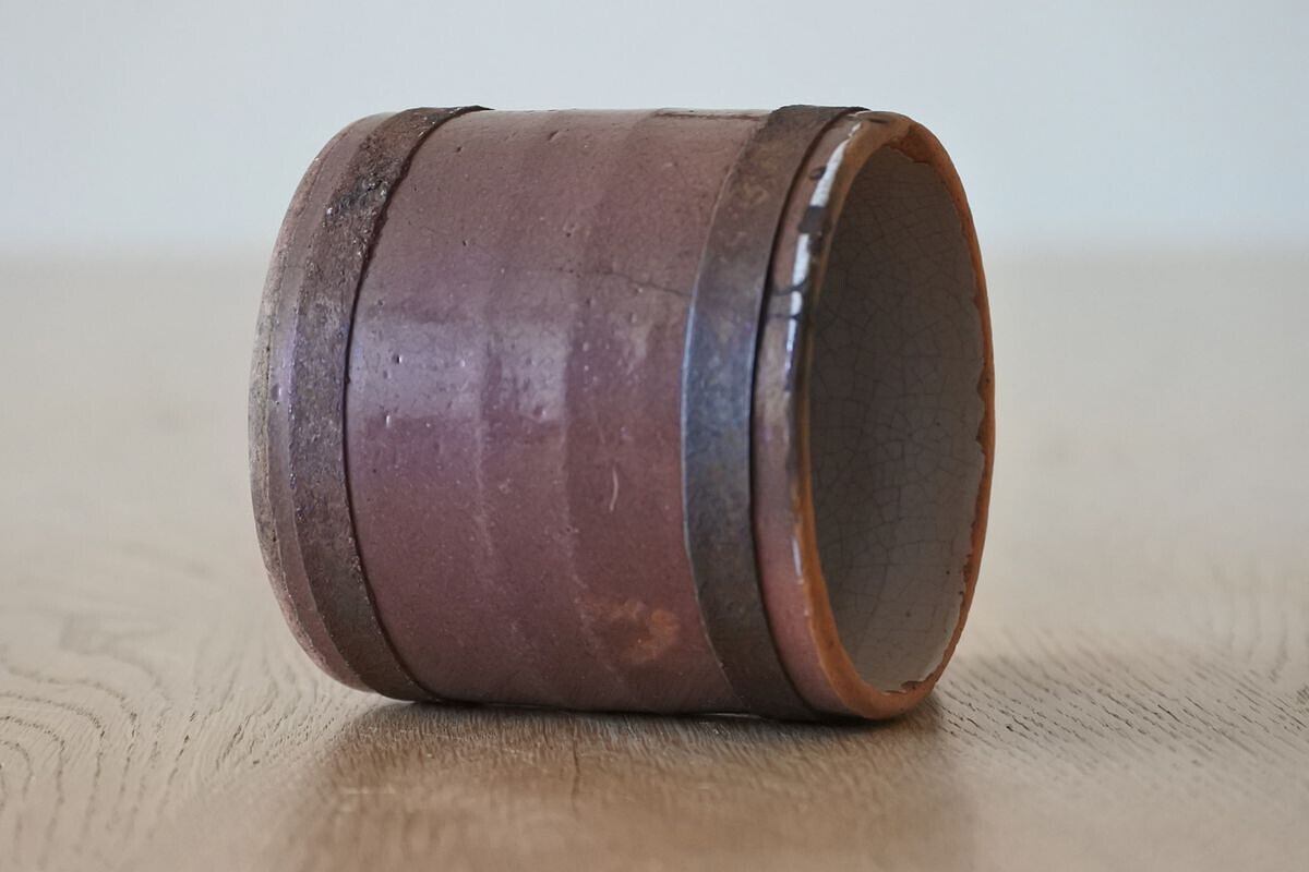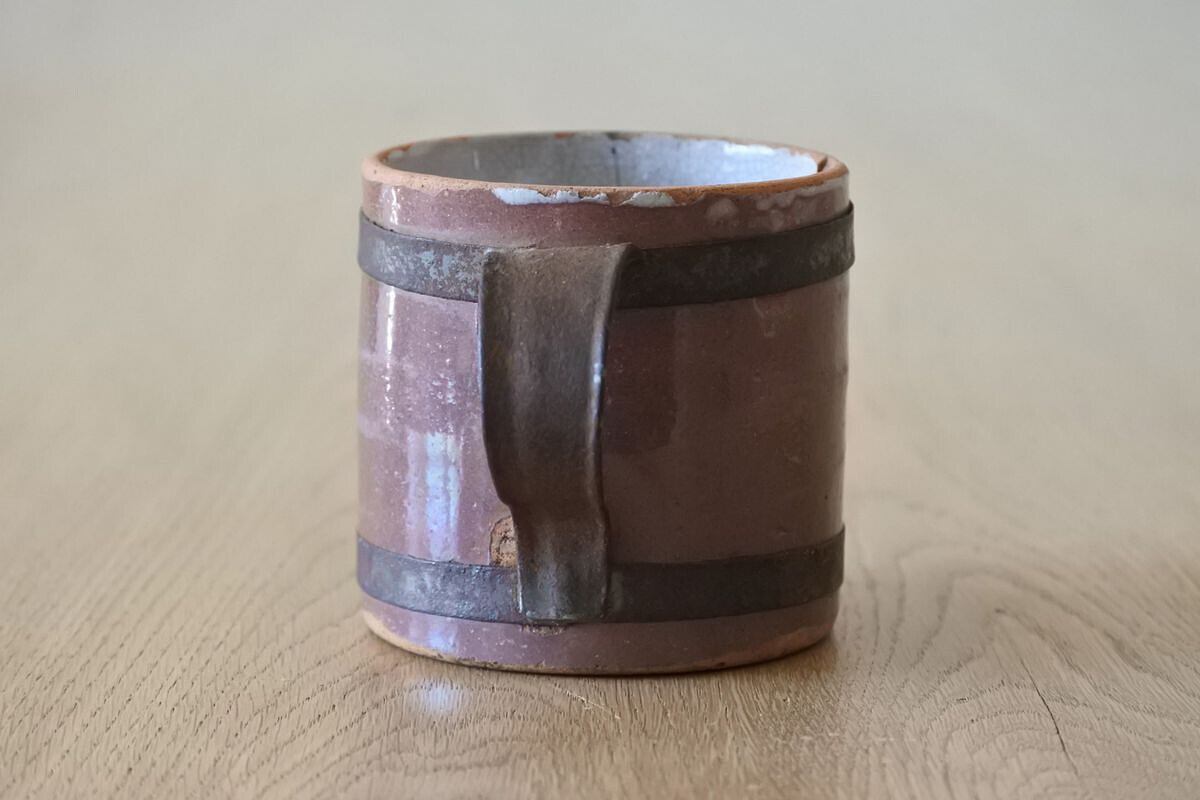 ココア色のキュノワール。フランス北部(ノルマンディ地方)で林檎の発泡酒などを飲む際に使用されていたマグカップです。鋼板で補修されたハンドルが、手仕事の素朴な温かさを感じさせます。シンプルなフォルムながら、異素材や色合いのコントラスト、細かな貫入のつくり出す表情にポエティックな味わいがあり、アート作品のような佇まい。傷みがあるため実用向きではありませんが、インテリアオブジェとして楽しんでいただければと思います。