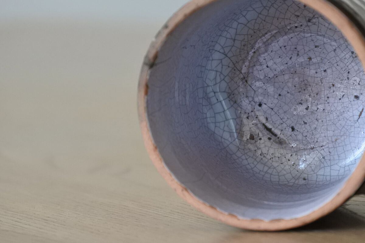 口辺りに釉薬の剥がれ、欠けあり。見込みに細かな貫入、釉薬の剥がれあり。胴にヒビあり。底にも釉薬の剥がれ、擦れて黒くなっている部分あり。鋼板に錆びあり。全体的に傷みが見られます(写真をご参考になさってください)。古いものの枯れた味わいとして楽しんでいただける方におすすめします。