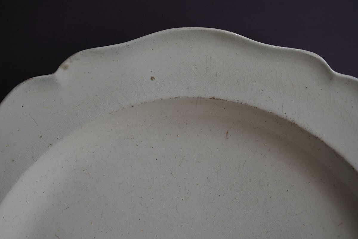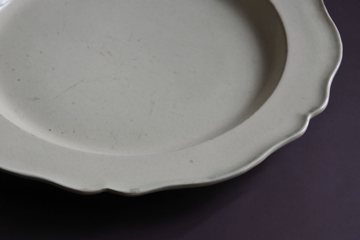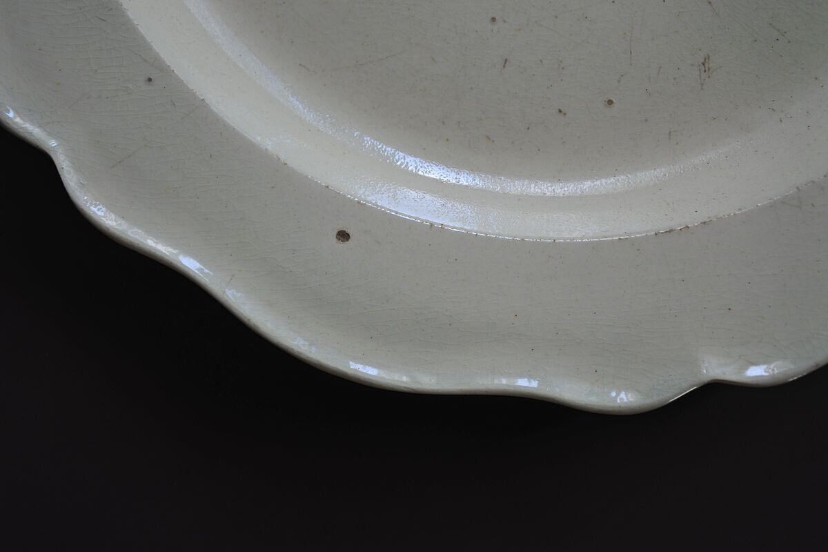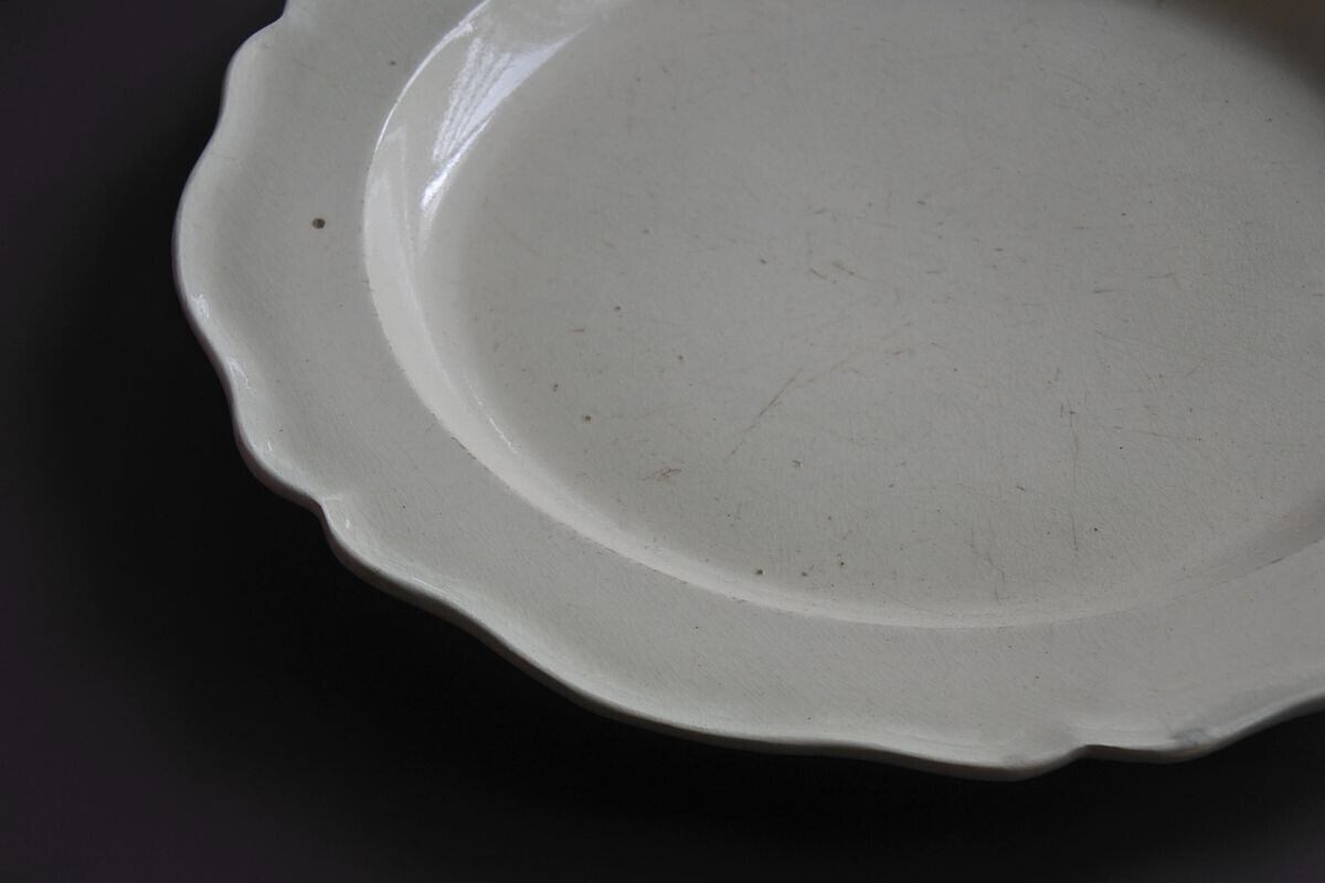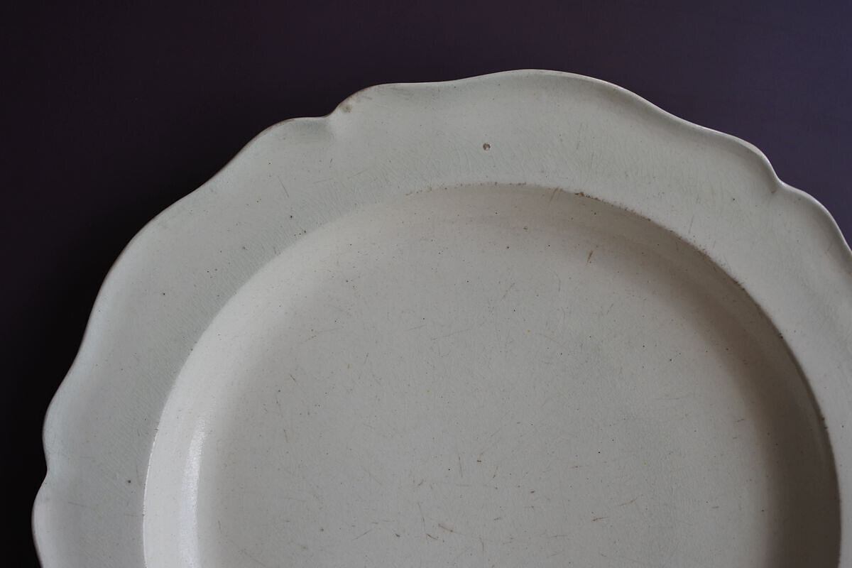 象牙色のやわらかな質感とマットな艶めきが魅力的な、古い時代の陶器。19世紀初めから半ば頃の品だと思われます。堂々としたサイズで(当時の)高級陶器らしい存在感がありますが、ゆったりした花リムのフォルムが全体におおらかな印象を与え、カトラリー痕や細かな貫入などにより、アンティークらしい味わいのある表情が生まれています。カンパーニュなど大き目のパンなどのせても絵になりますし、リースやグラス入りのキャンドルを並べて、トレーのようにディスプレイされても良さそうです。