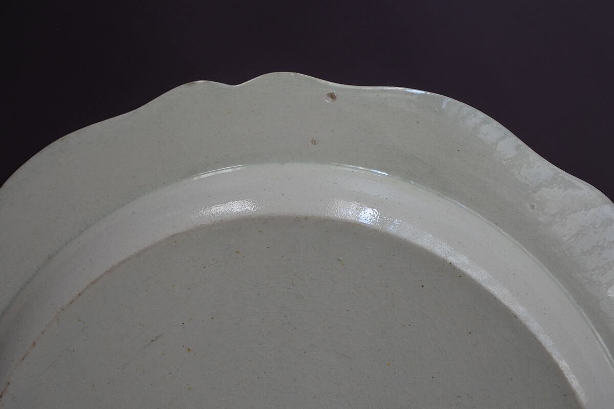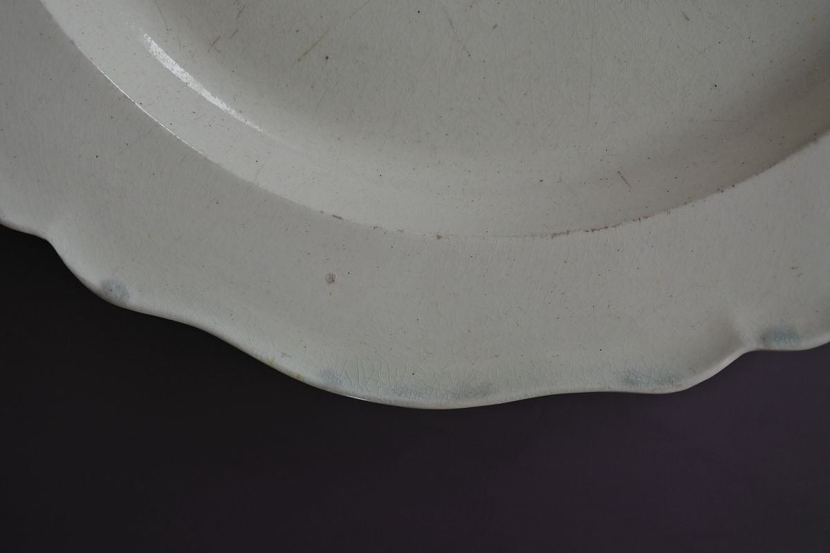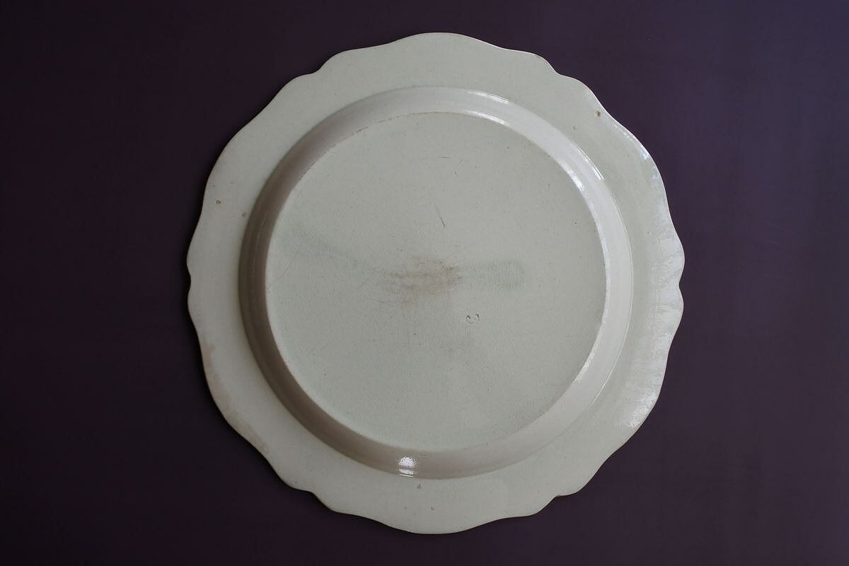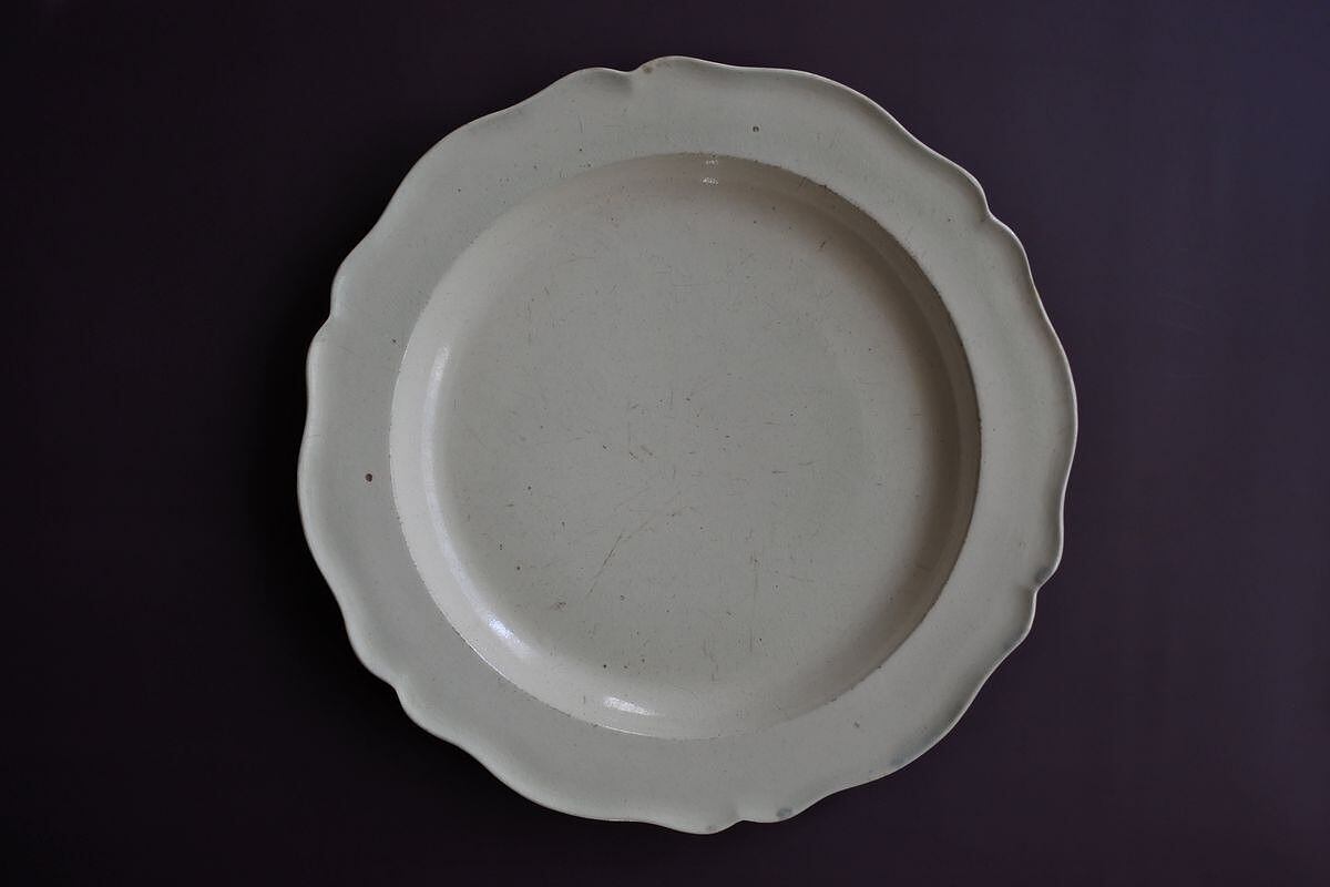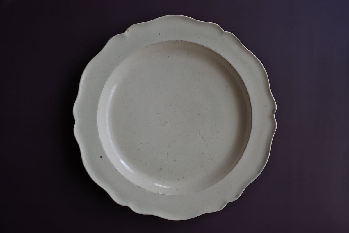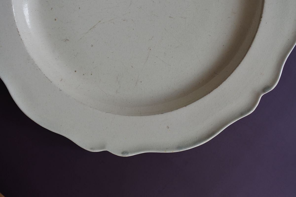 象牙色のやわらかな質感とマットな艶めきが魅力的な、古い時代の陶器。19世紀初めから半ば頃の品だと思われます。堂々としたサイズで(当時の)高級陶器らしい存在感がありますが、ゆったりした花リムのフォルムが全体におおらかな印象を与え、カトラリー痕や細かな貫入などにより、アンティークらしい味わいのある表情が生まれています。カンパーニュなど大き目のパンなどのせても絵になりますし、リースやグラス入りのキャンドルを並べて、トレーのようにディスプレイされても良さそうです。
