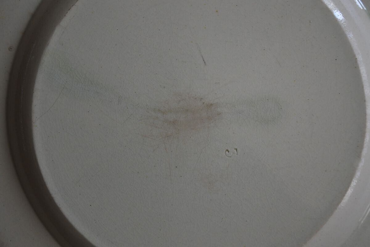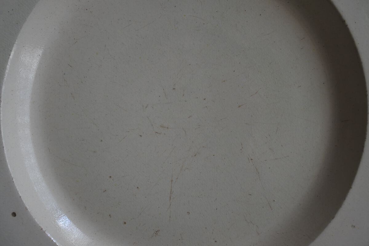 大きな欠けやひびなし。象牙色。所々細かな貫入が見られます。リムに釉薬の剥がれあり(写真10)。見込みにカトラリー痕あり。気泡や異物(窯焼きの際に生じたと思われる)あり。釉薬の溜まり部分がグレーがかって見えます(写真11)。裏面に目跡(器を重ねて焼いた際の跡)、貫入、傷や染みあり。底の部分が、(完全なフラットではなく)中央にかけてやや厚みを帯びているためガタつきがあり、置いた時に左右が僅かに浮いたような状態になります。傷みや歪みなど、古いものの味わいとして楽しんでくださる方におすすめします。