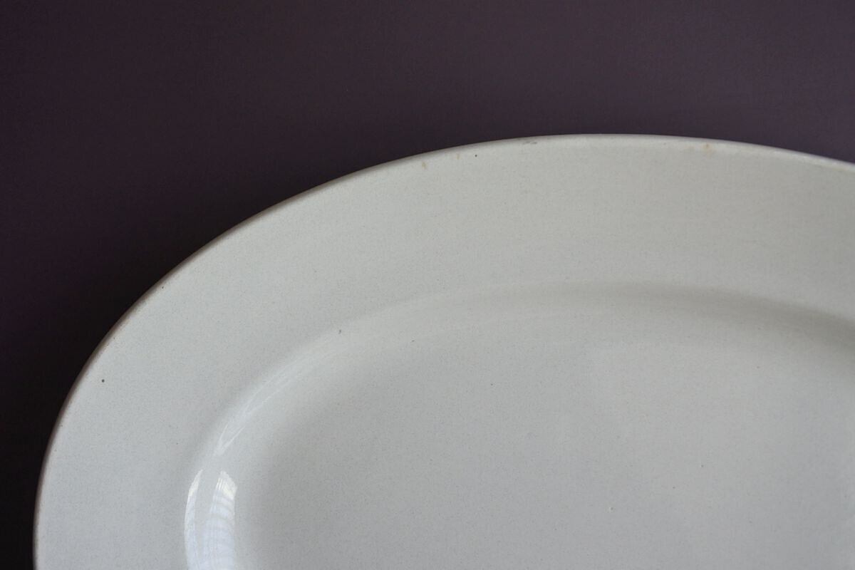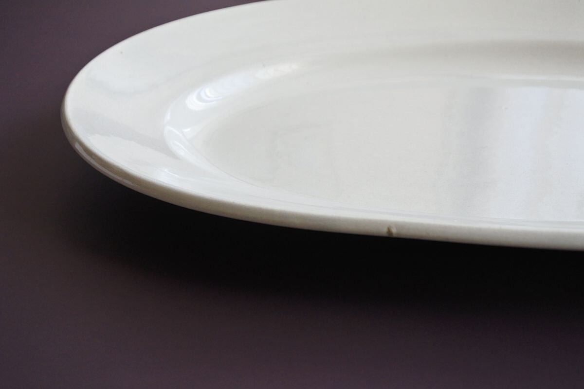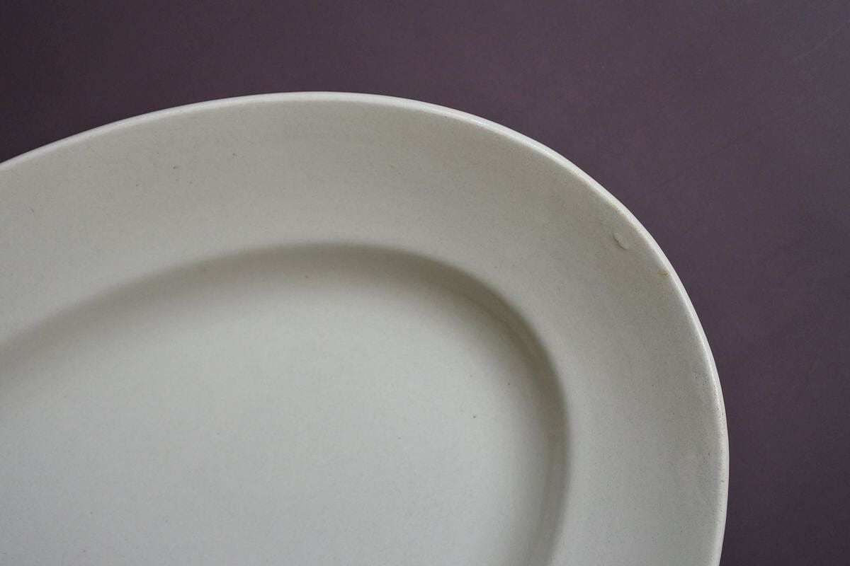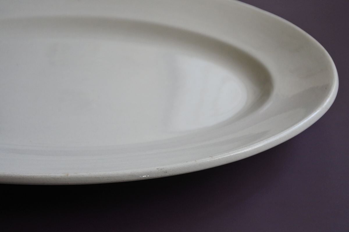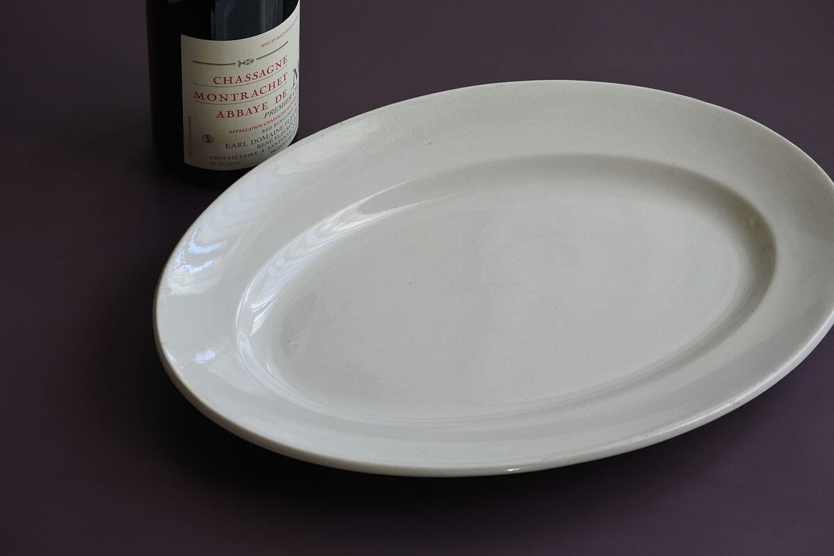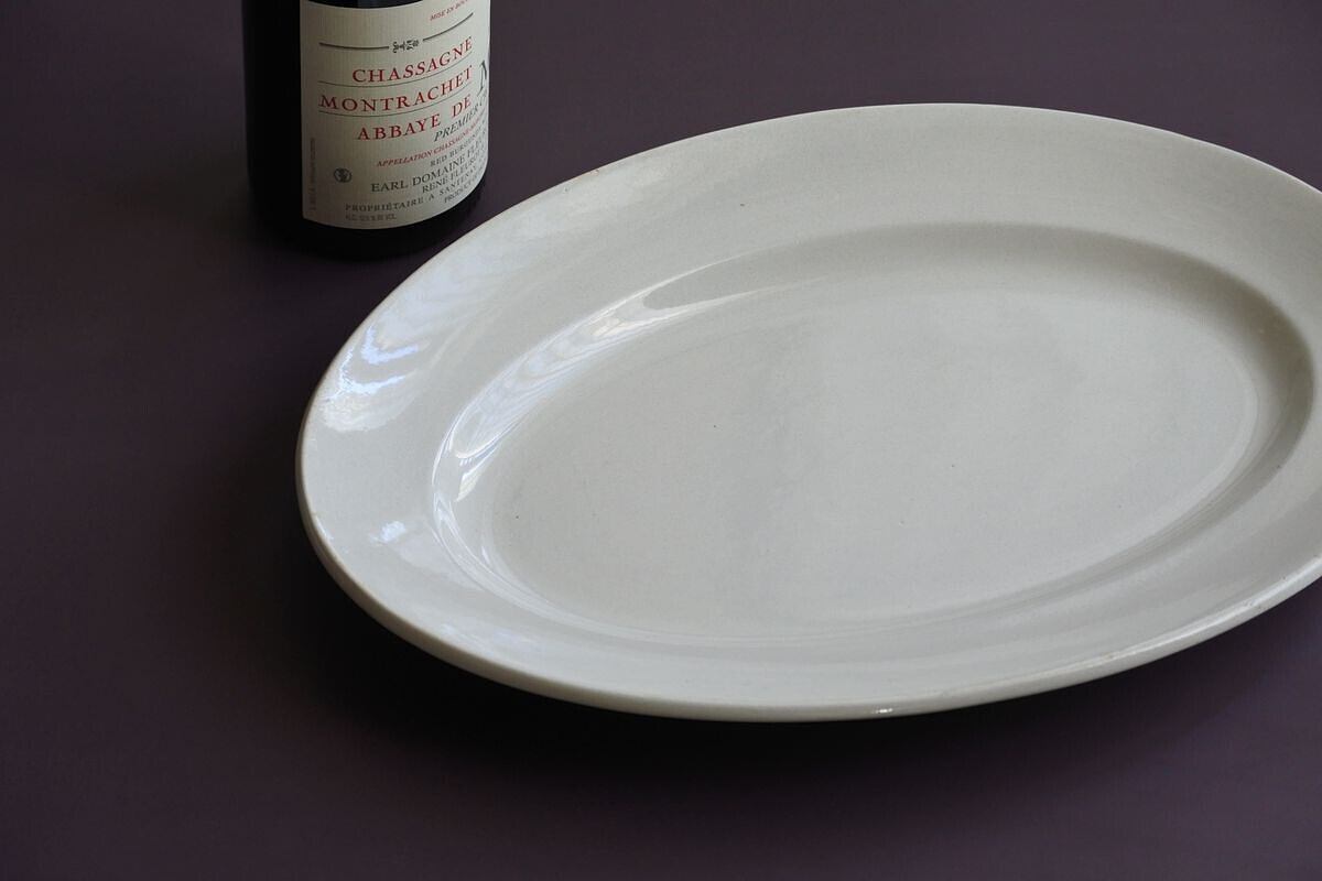 シンプルなオーバル皿。ややグレーがかった色合い。ロレーヌ地方の名窯のひとつ、Niderviller(ニーデルヴィレー)の窯印があります。ファイアンス焼きで知られる窯ですが、中後期には軟磁器も生産しており、ご紹介しているオーバル皿は19世紀終わり頃のものと思われます。同時代のこの種の皿は、白絵具を厚く塗ったようなマットな質感のものが多く魅力的ですが、こちらは釉薬が素地にすっと染み込んだような透明感と艶があり、ぽってりしたフォルムをきりっと軽やかに見せています。サイズ的には大皿の部類に入るものの、リム幅があるため中サイズぐらいの印象。メイン料理はもちろん、パンや前菜を盛り合わせて気軽に楽しまれるのもいいかと思います。