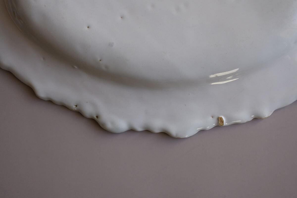 シンメトリーなフリルが華やいだ印象の白釉皿。小振りでスマートな印象です。艶めきは十分ですが、リムの縁がぐるりと剥がれ、ベージュ色の素地が覗いています。見込みやリムにも穴あきなどあり、枯れた味わい。仕入れの時、薄暗いアトリエのキャビネットに、グラスキャンドルをのせて置いてあるのが目に留まり、静かに揺れる灯が照らし出す古寂びた表情に魅力を感じました。窯印はありませんが、釉薬の質感や指で弾いた時の金属音などから、ムスティエ、バラージュなどと同質の、18世紀終わり頃から19世紀初め頃に焼かれたファイアンス皿だと思われます。パンやフルーツはもちろん、スワッグやキャンドルなどのせてトレーのようにディスプレイされても楽しめそうです。