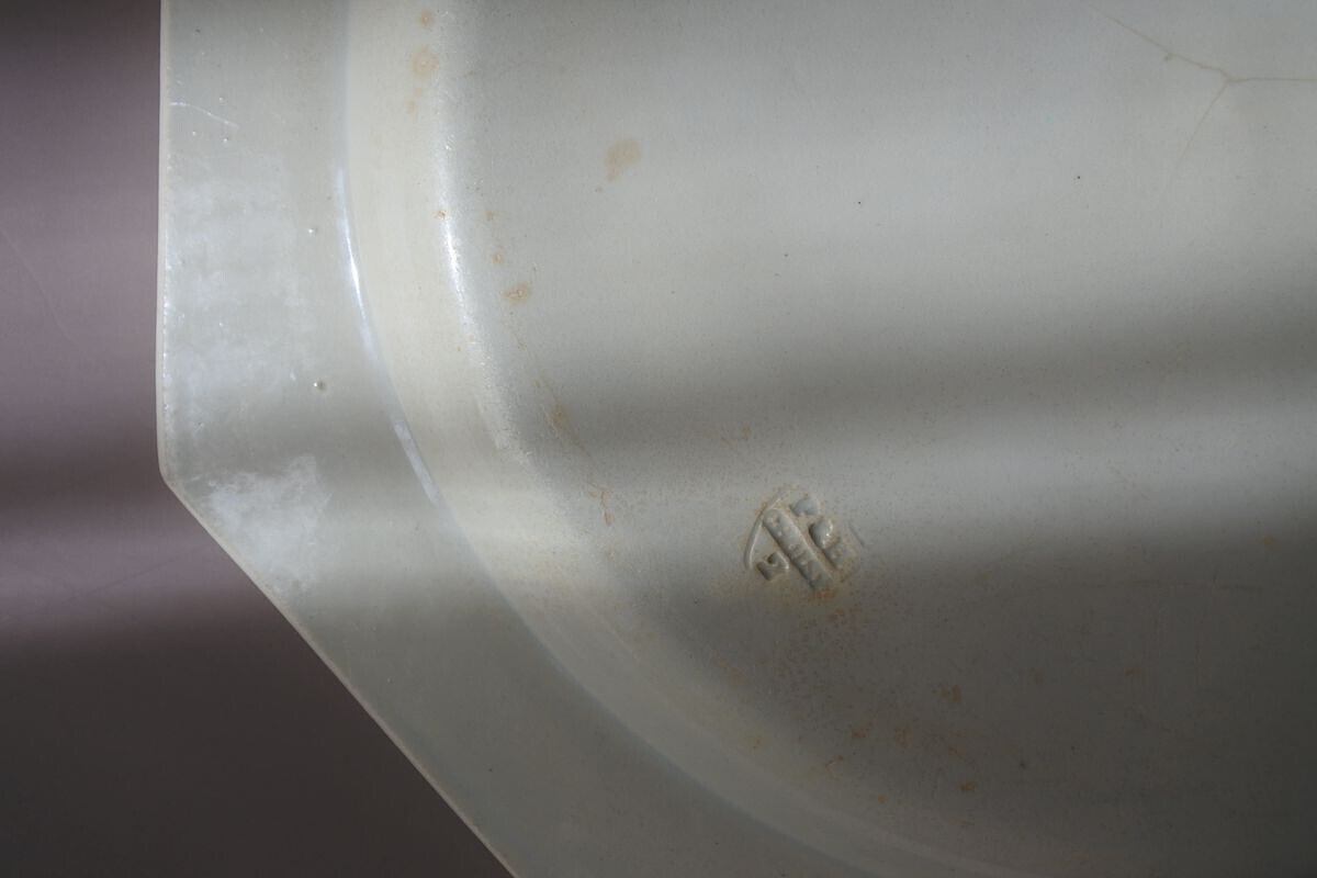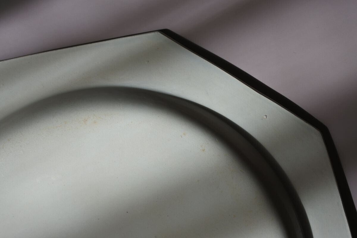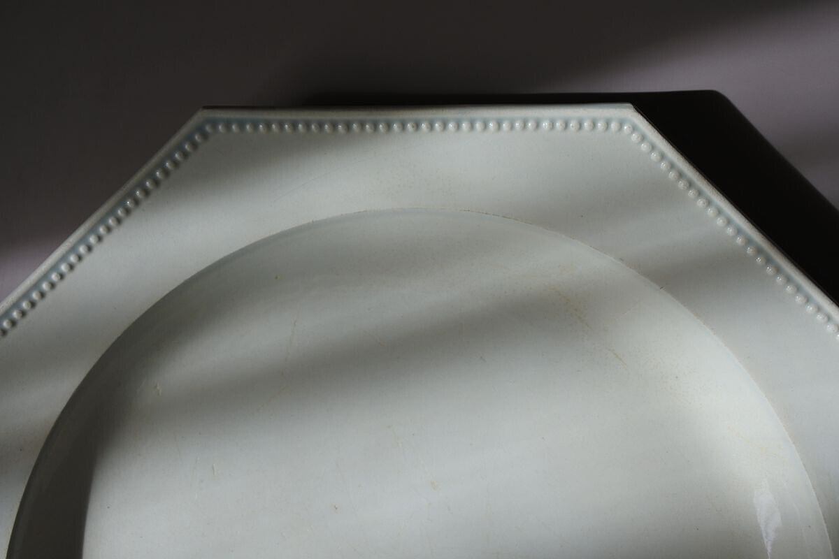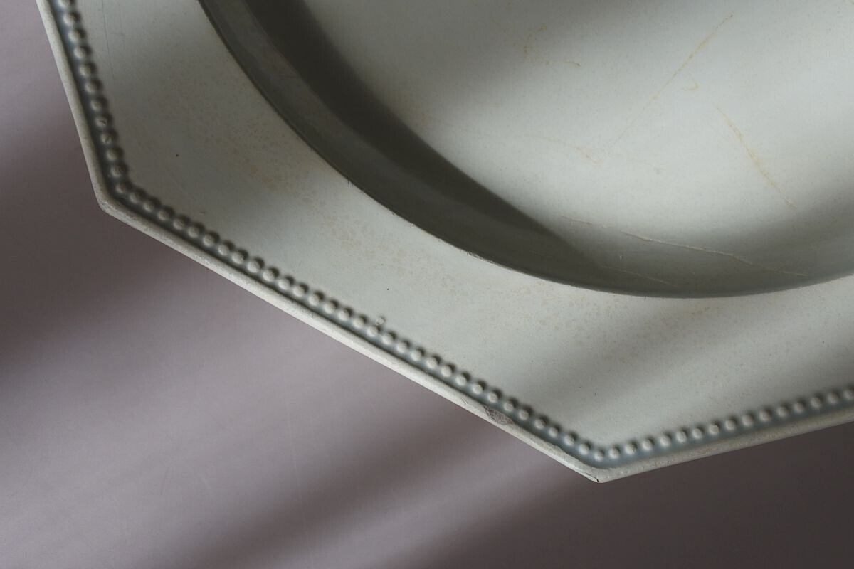 カトラリー痕や色付など傷みのある表情が味わい深いオクトゴナル平皿。Choisy Le Roi(ショワジー ル ロワ)窯の創設者 Paillart 兄弟の名前が刻まれた、19世紀初期の品です。マットで上品な艶感のある肌合いや、彫塑のようなフォルムが魅力的な、ファイアンスフィーヌと呼ばれる古い時代の陶器。リムを縁取る繊細なパール柄と古寂びた傷みとのコントラストが、情緒的で耽美な雰囲気を漂わせています。ケーキやフルーツ、パンなどのせてクラシカルな雰囲気を楽しまれるのもいいかもしれません。さり気なく絵になる一枚。