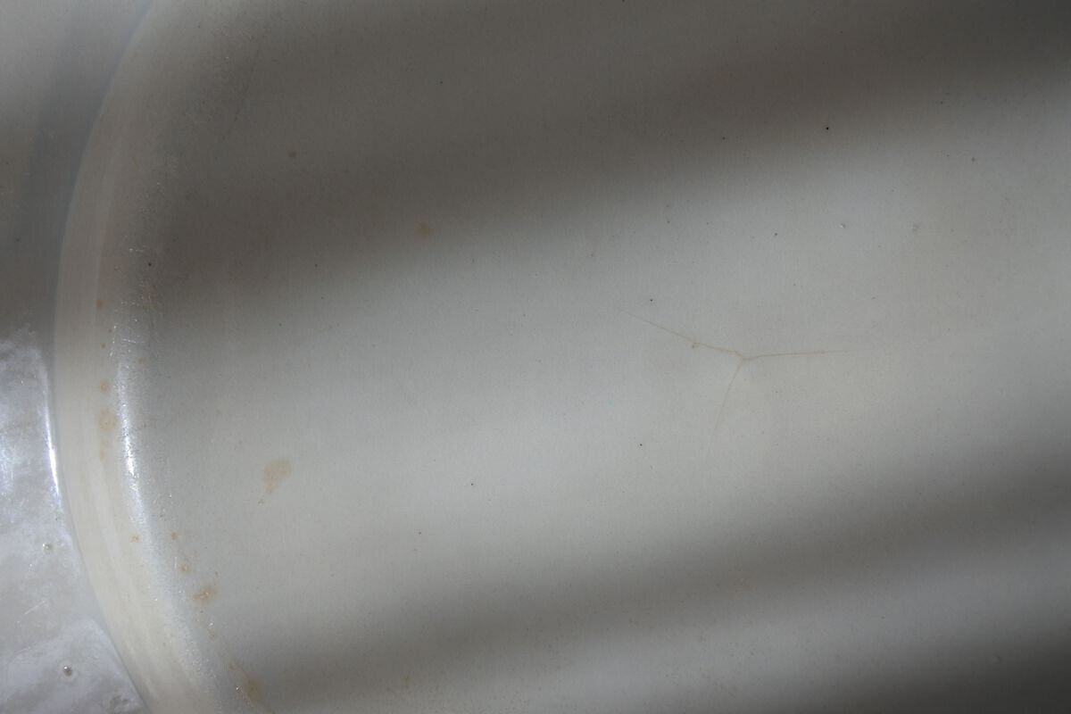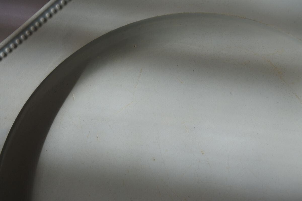 表面見込みにカトラリー痕、色付きあり。リムにも色付きあり。縁に小さなチップあり。裏面に目跡(器を重ねて焼いた際の跡)のように見える異物の貼り付きあり。高台に擦れによる傷、色付きあり。中央に(ヒビのように見える)傷あり。色はオフ白(または白みがかった象牙色)。釉薬のムラにより薄っすらグレーがかって見える部分があります。枯れた味わいを楽しんでいただける方におすすめします。