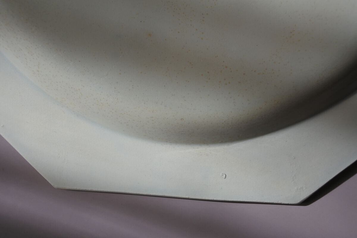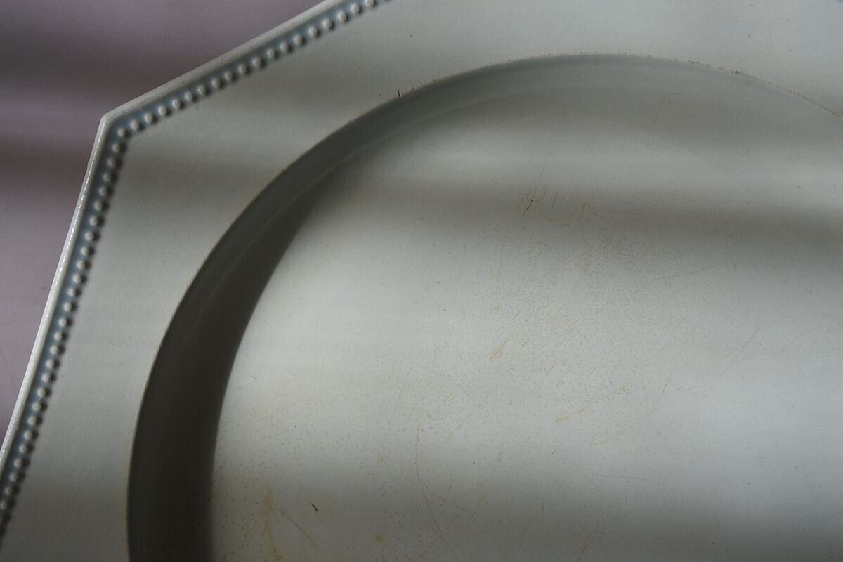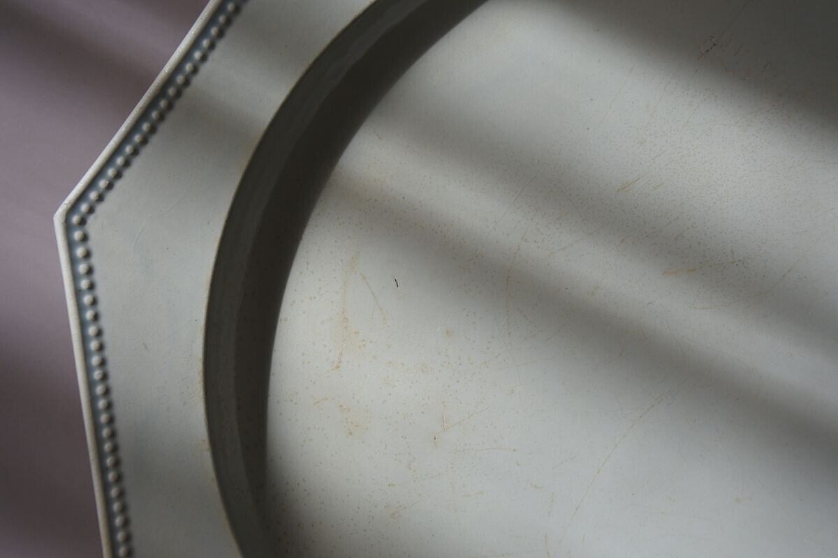 カトラリー痕や色付など傷みのある表情が味わい深いオクトゴナル平皿。Choisy Le Roi(ショワジー ル ロワ)窯の創設者 Paillart 兄弟の名前が刻まれた、19世紀初期の品です。マットで上品な艶感のある肌合いや、彫塑のようなフォルムが魅力的な、ファイアンスフィーヌと呼ばれる古い時代の陶器。リムを縁取る繊細なパール柄と古寂びた傷みとのコントラストが、情緒的で耽美な雰囲気を漂わせています。ケーキやフルーツ、パンなどのせてクラシカルな雰囲気を楽しまれるのもいいかもしれません。さり気なく絵になる一枚。