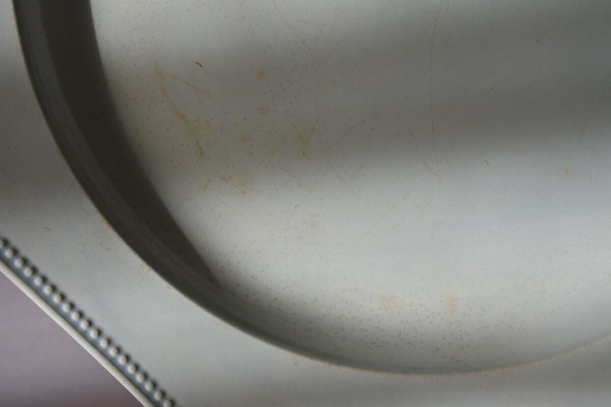 表面見込みにカトラリー痕、色付きあり。青点(窯焼きの際に生じたと思われる)あり。リムにも色付きあり。縁に小さなチップあり。裏面に目跡(器を重ねて焼いた際の跡)あり。高台に擦れによる傷、色付きあり。色はオフ白(または白みがかった象牙色)。釉薬のムラにより薄っすらグレーがかって見える部分があります。枯れた味わいを楽しんでいただける方におすすめします。
