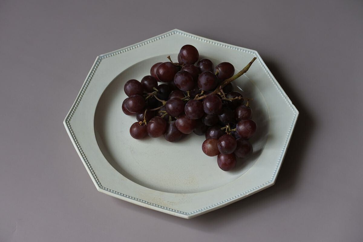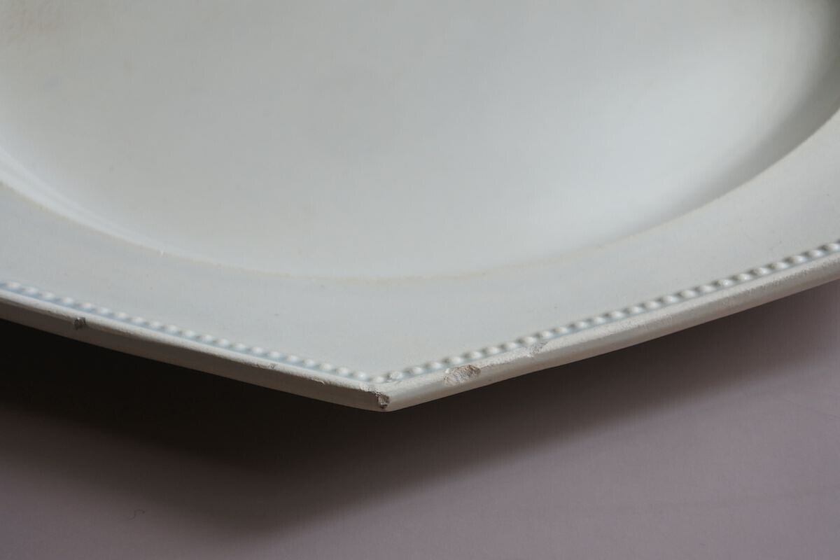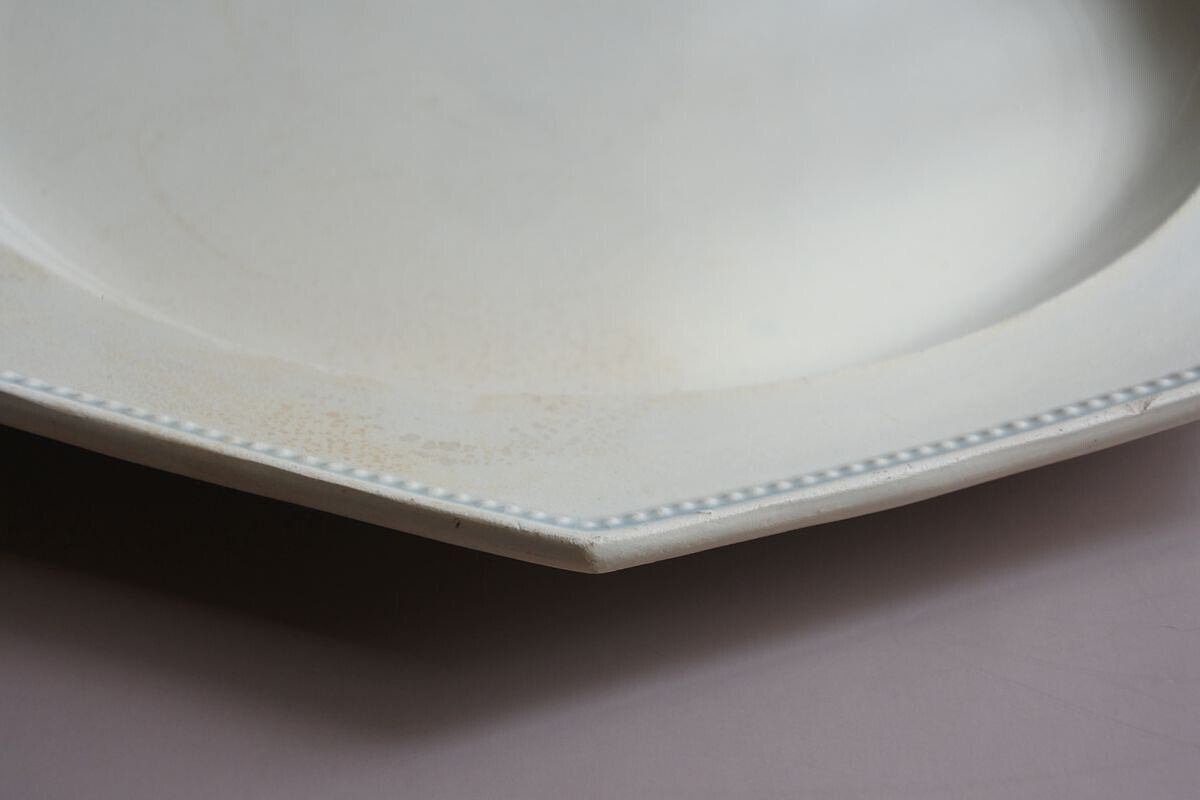 カトラリー痕や色付など傷みのある表情が味わい深いオクトゴナル平皿。Choisy Le Roi(ショワジー ル ロワ)窯の創設者Paillart兄弟の名前が刻まれた19世紀初期の品です。マットな艶感のある肌合いや、彫塑のようなフォルムが魅力的な、ファイアンスフィーヌと呼ばれる古い時代の陶器。リムを縁取る繊細できりりとしたパール柄と、時間の経過を感じさせるゆるやかな傷みとのコントラストが、情緒的で儚げな雰囲気を漂わせています。古寂びた味わいがお好きなかたにおすすめ。さり気なく絵になる一枚です。ケーキやフルーツ、パンなどのせたり、キャンドルグラスをのせたりして、閑寂な佇まいを楽しまれるのもいいかもしれません。