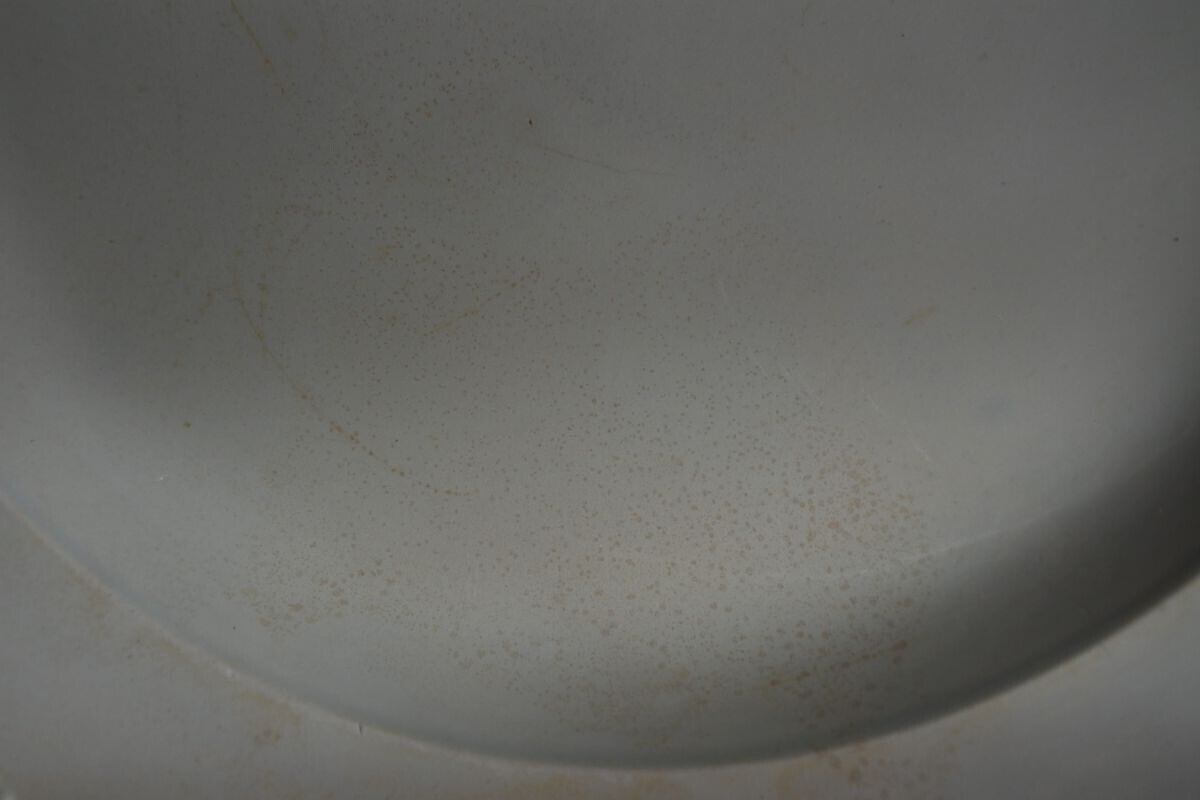 表面見込みにカトラリー痕、色付きあり。釉薬の小さな剥がれ、ムラによる凹凸あり。リムにも色付きあり。縁に所々チップが見られます。裏面に目跡(器を重ねて焼いた際の跡)、色付きあり。高台に擦れによる傷あり。色はオフ白(または白みがかった象牙色)。釉薬のムラや溜まりにより、グレーがかって見える部分があります。枯れた味わいを楽しんでくださる方におすすめします。