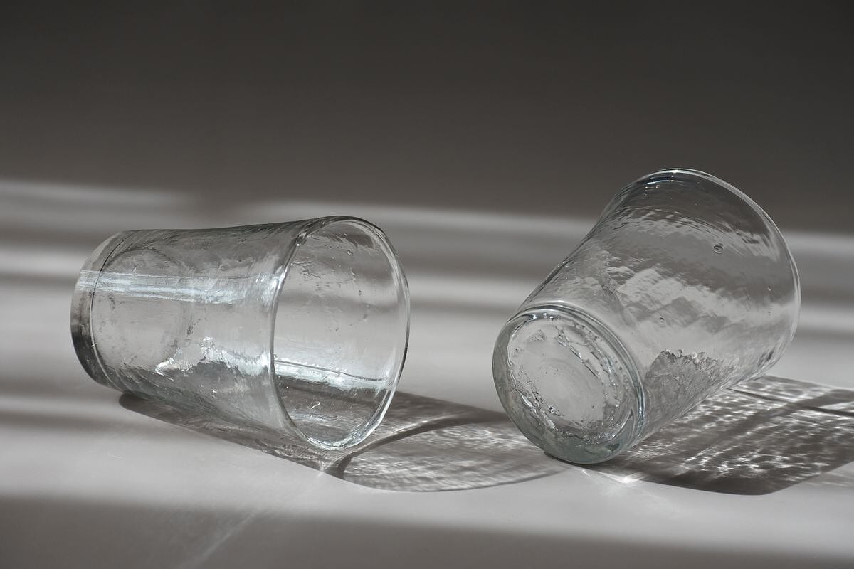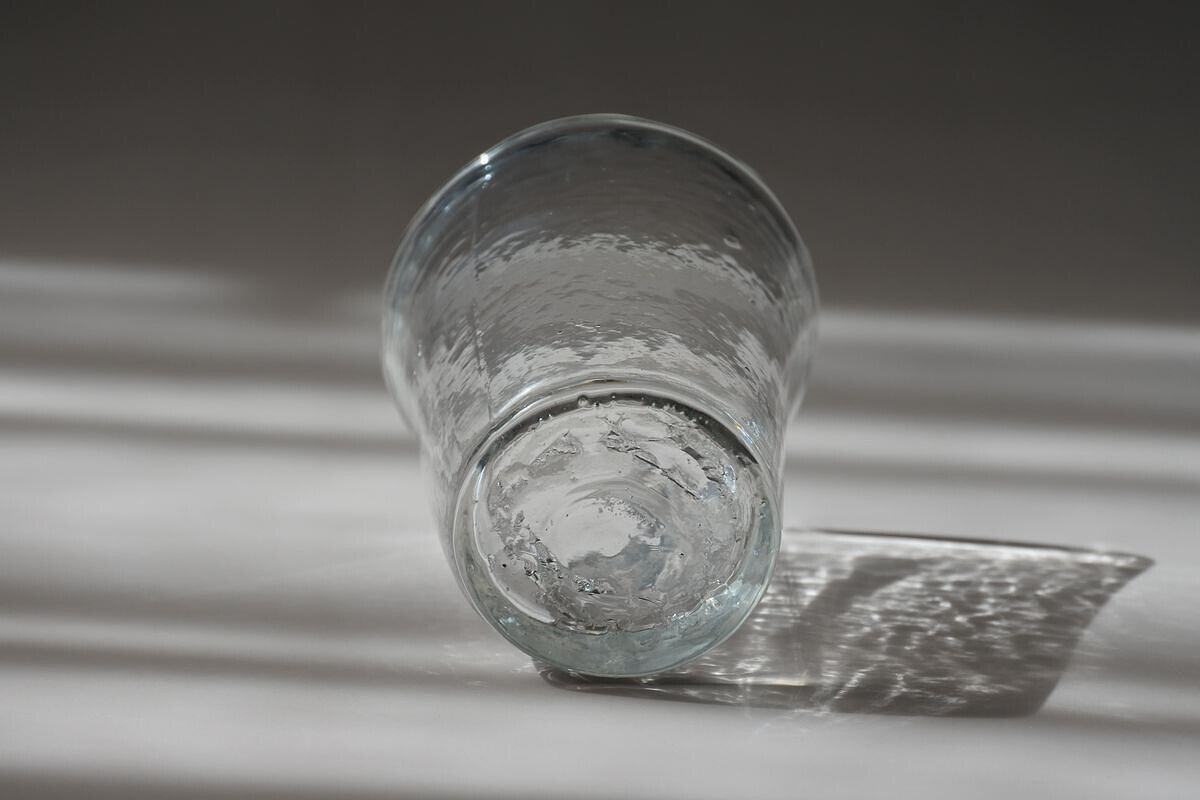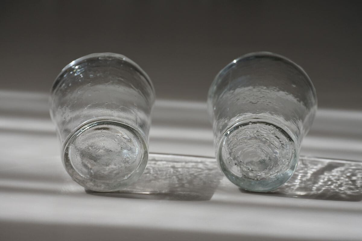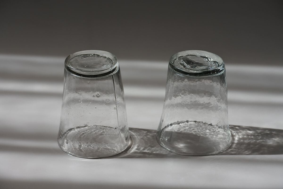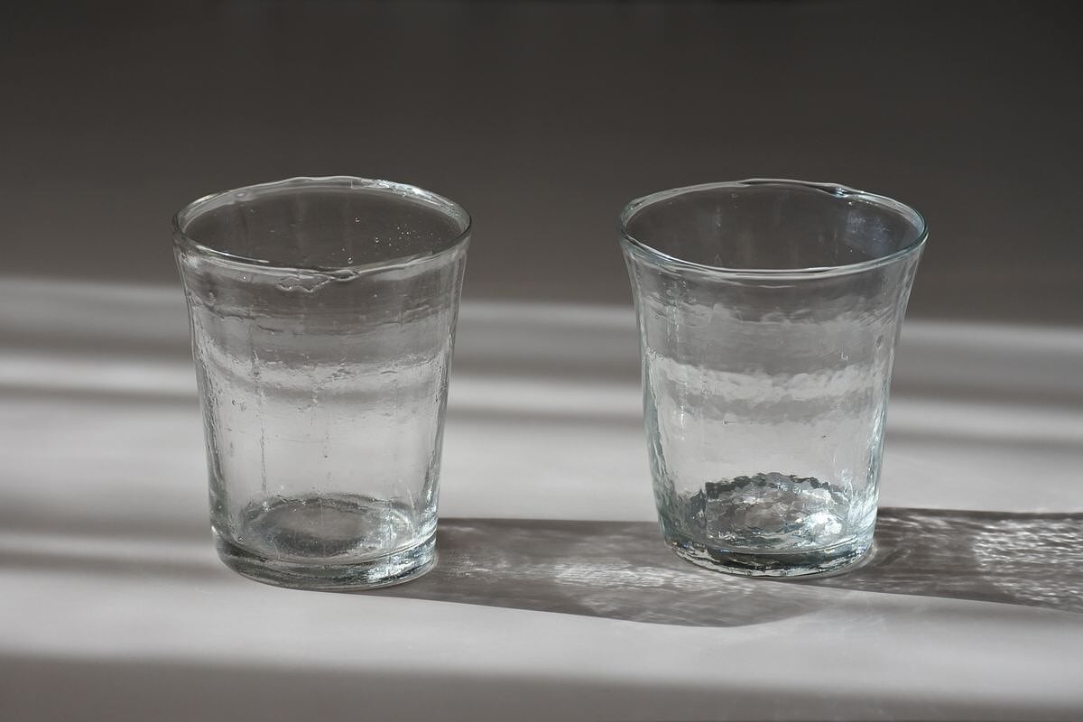 写真をご参考になさってください。揺らぎや歪み、大小の気泡、異物、凹凸(欠けのように見える凹みなど)、底のざらつき、アイスクラック模様あり。片方のグラスの縁の内側に、指で触ると分かる程度の小さな欠けあり。ペアBに比べると、やや細身で高さのあるフォルムです。厚みやサイズは少しずつ異なります。個々のグラスのお取替えなどは受け付けておりませんのでご了承ください。