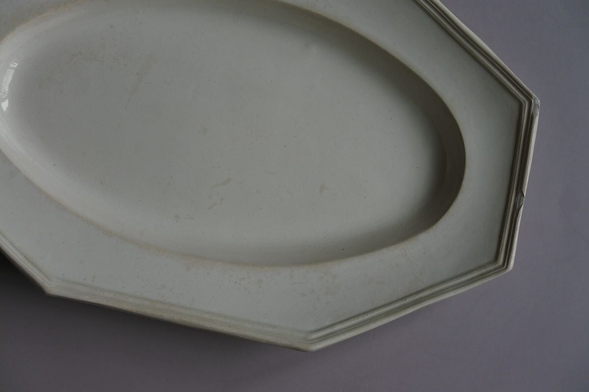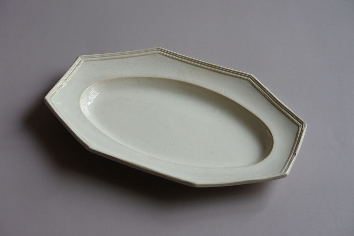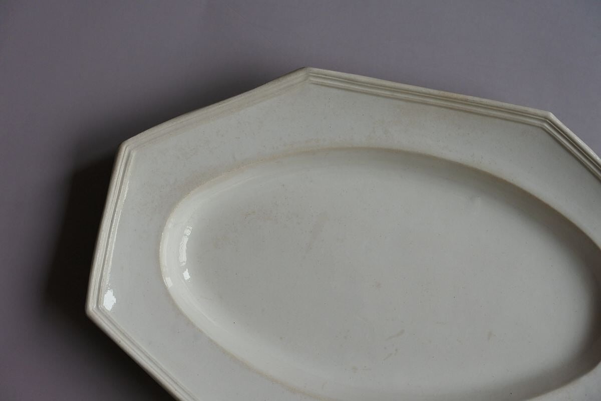 すっきりしたデザインのオクトゴナル長皿。やわらかな色付きが、古ものらしいニュアンスのある表情を生み出しています。マットな艶感と彫塑のようなフォルムが魅力的な、ファイアンスフィーヌと呼ばれる19世紀初め頃の陶器。リム幅がフレームの役割を果たし、載せるものを引き立ててくれます。季節ごとのフルーツや焼き菓子など、並べるだけで絵になりそうです。目立った傷などはないものの、リムの縁に2箇所欠けが見られます。金継ぎなど補修してお使いいただいても面白いかと思います。