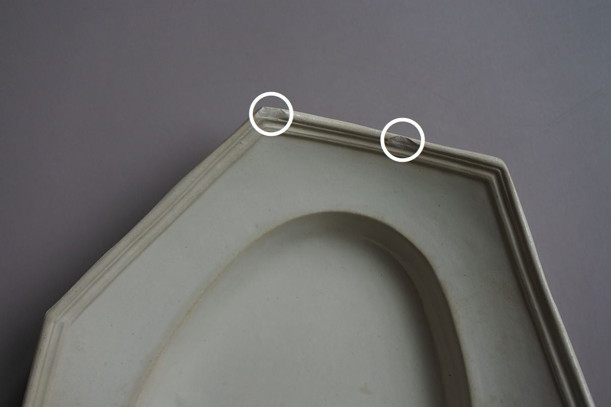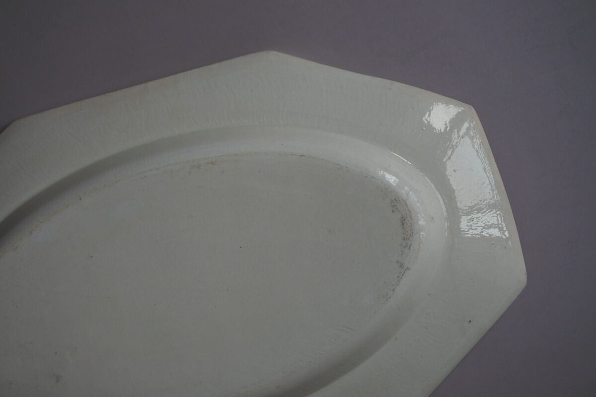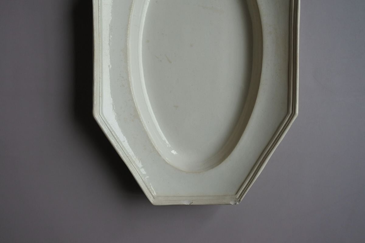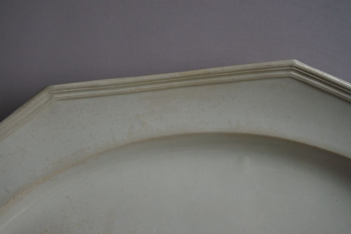 すっきりしたデザインのオクトゴナル長皿。やわらかな色付きが、古ものらしいニュアンスのある表情を生み出しています。マットな艶感と彫塑のようなフォルムが魅力的な、ファイアンスフィーヌと呼ばれる19世紀初め頃の陶器。リム幅がフレームの役割を果たし、載せるものを引き立ててくれます。季節ごとのフルーツや焼き菓子など、並べるだけで絵になりそうです。目立った傷などはないものの、リムの縁に2箇所欠けが見られます。金継ぎなど補修してお使いいただいても面白いかと思います。