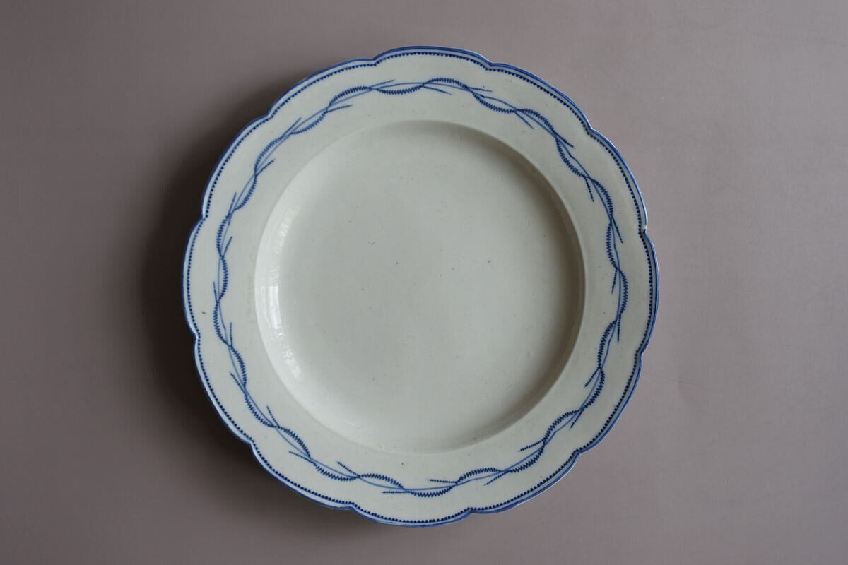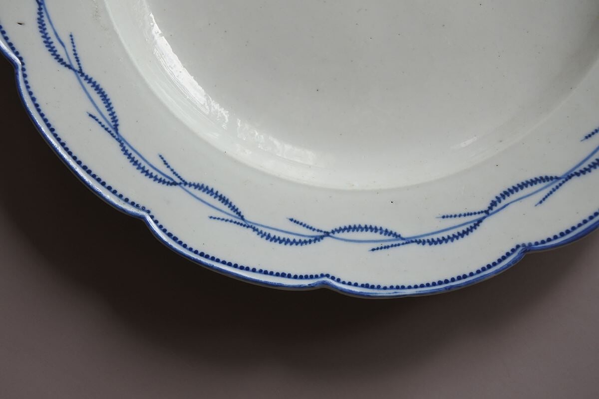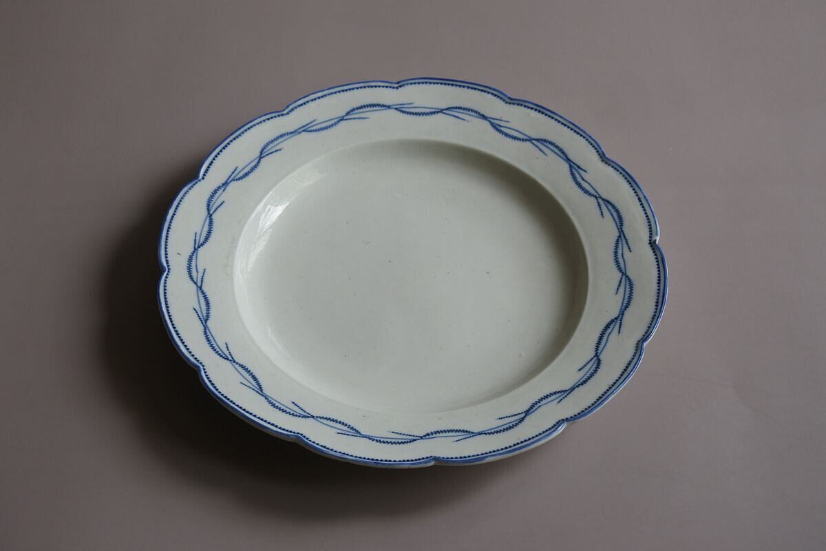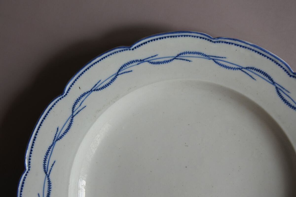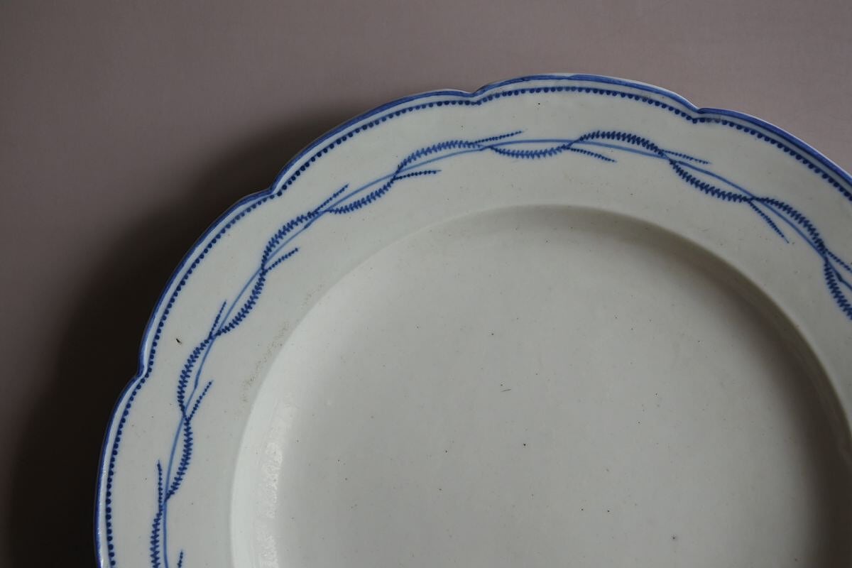 陶器の風合いを残したやわらかな質感の軟質磁器。しっかりした厚みと心地良い重みがあります。北フランスARRAS(アラス)の窯印のある18世紀終わり頃の品。幅の広い花リムはドイツのマイセンを、絵付け模様はベルギーのトゥルネー窯の花綱をイメージさせます。人気製品の要素を取り入れながら、マイセンに比べると素朴で軽やか、トゥルネーに比べるとスマートで華やいだ印象を漂わせるのは、フランスらしいセンスを効かせたからと言えるのかもしれません。控えめな艶のある乾いた白に、落ち着いたブルーの組み合わせがすっきりしていて、載せるものを引き立ててくれそう。存在感のある魅力的な品です。