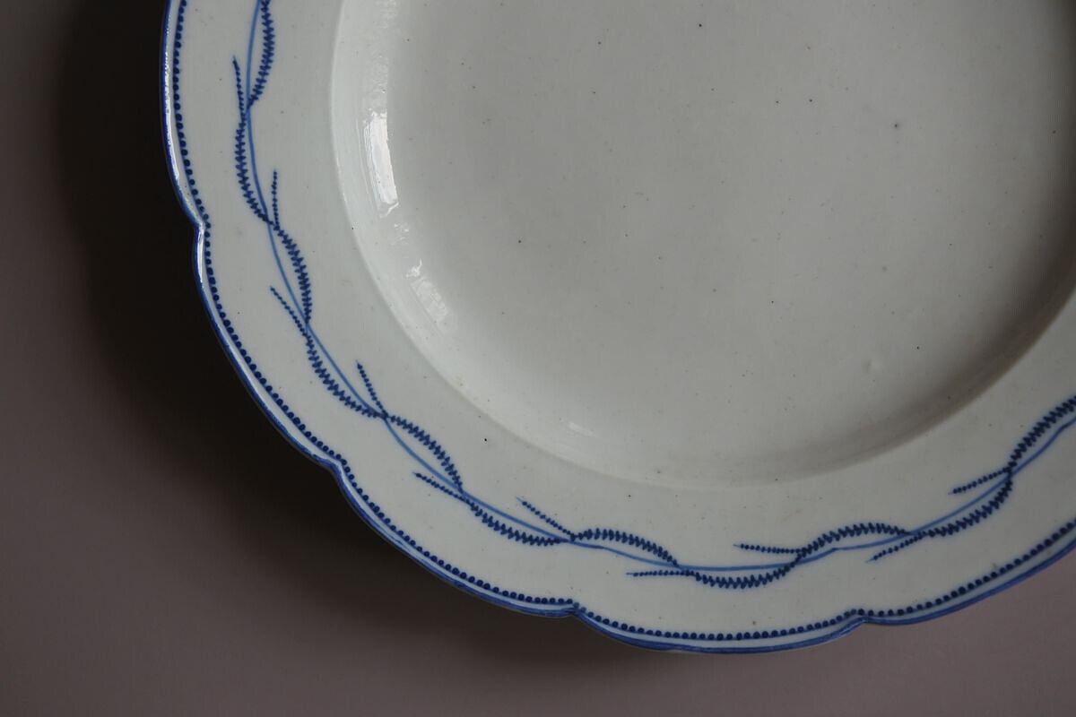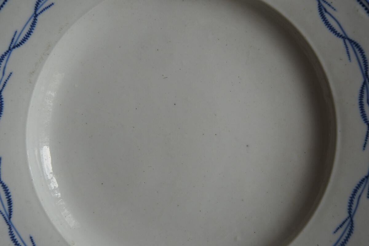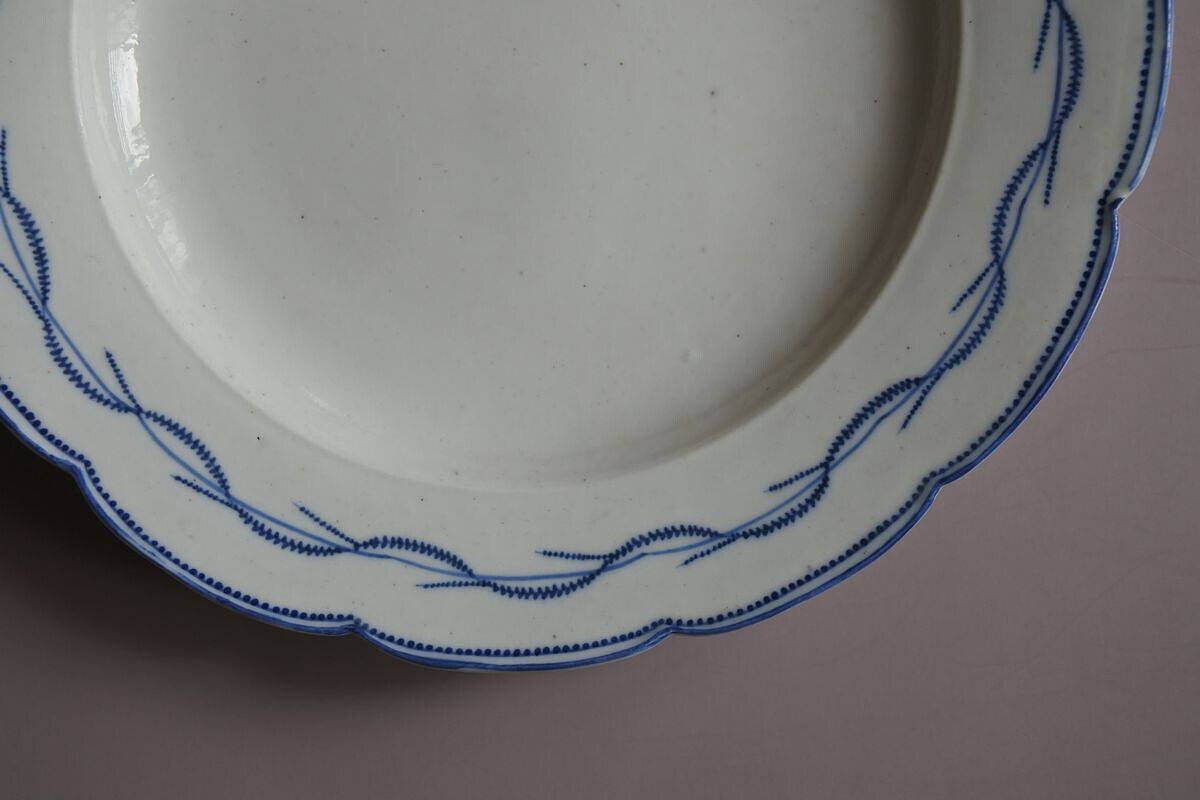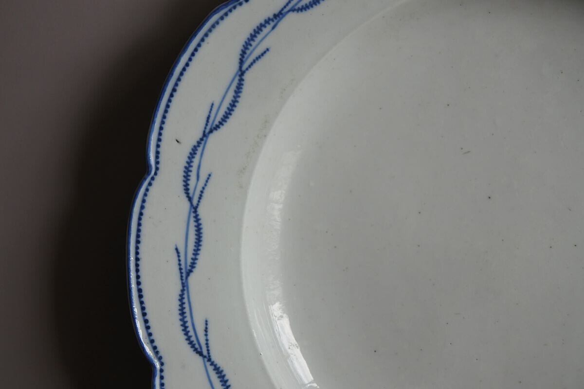 フォルムの歪みあり。欠けやひびは見られません。全体に黒点や穴あき(窯焼きの際に生じたと思われる)、凹凸あり。黒点が集まって汚れのように見える箇所あり。釉薬の成分変化により艶にムラあり。小さな傷あり。カトラリー痕はほとんど見られません。色味は白。絵付けは明るめの紺色(滲みや濃淡あり)。古いものですので劣化はありますが状態は悪くありません。味わいを楽しんで下さる方におすすめします。
