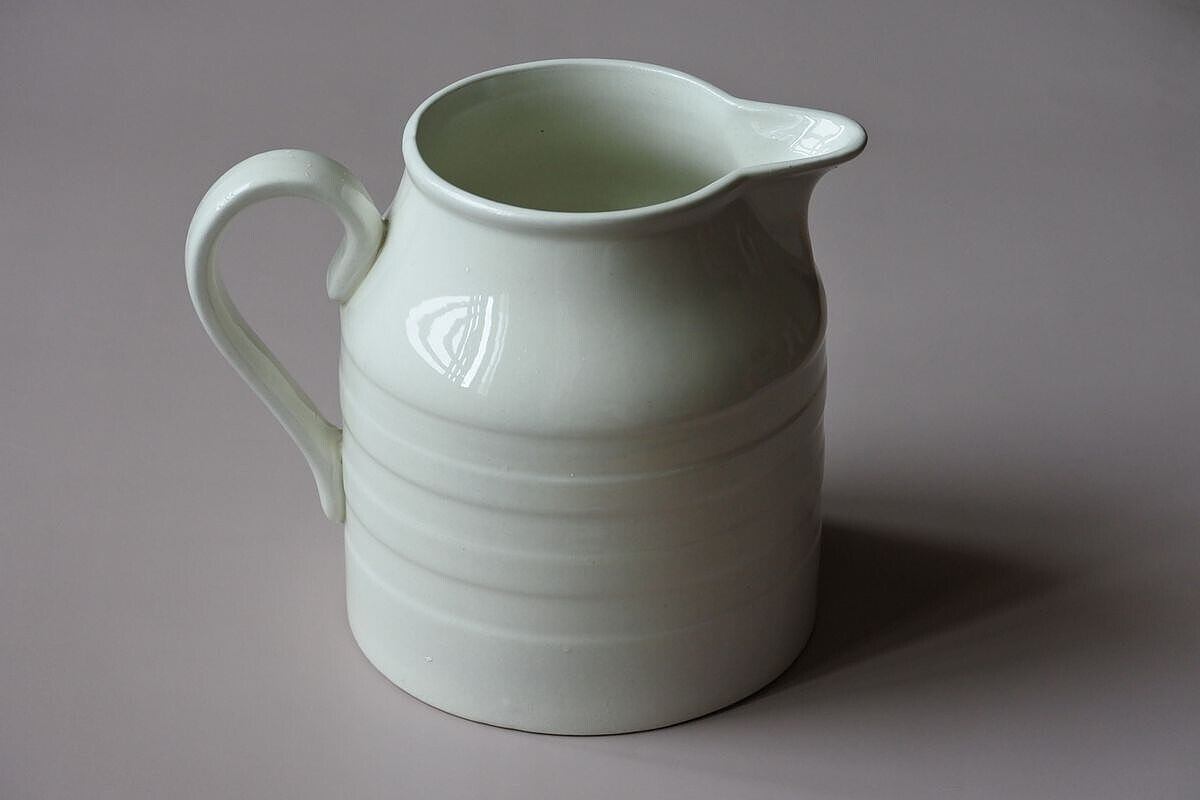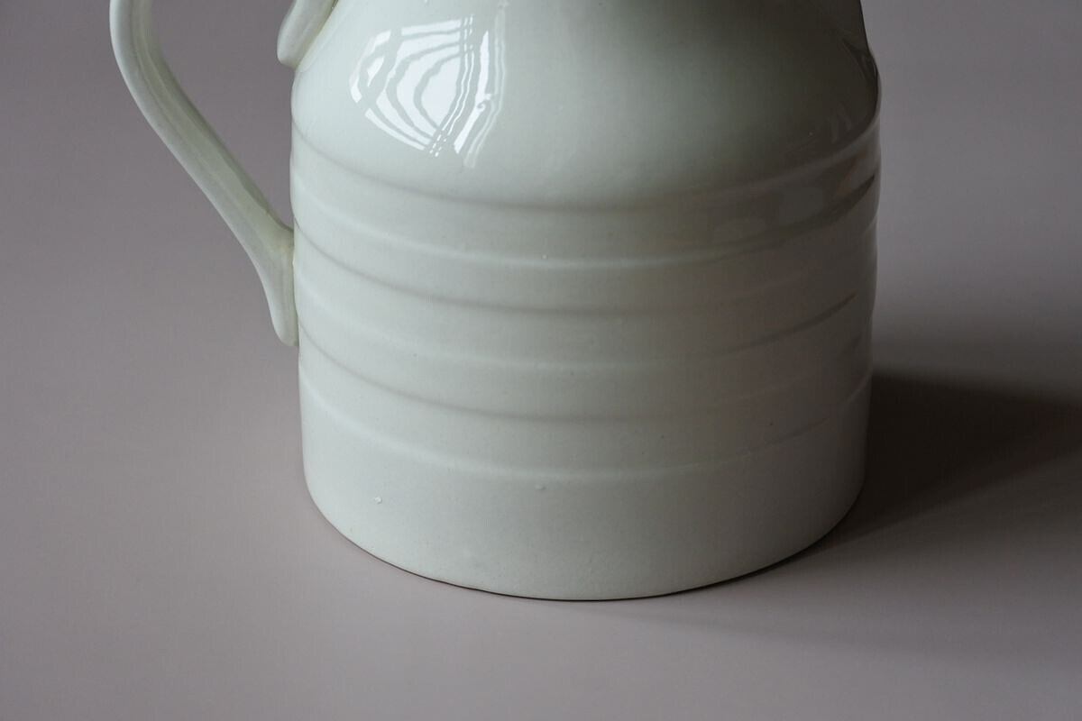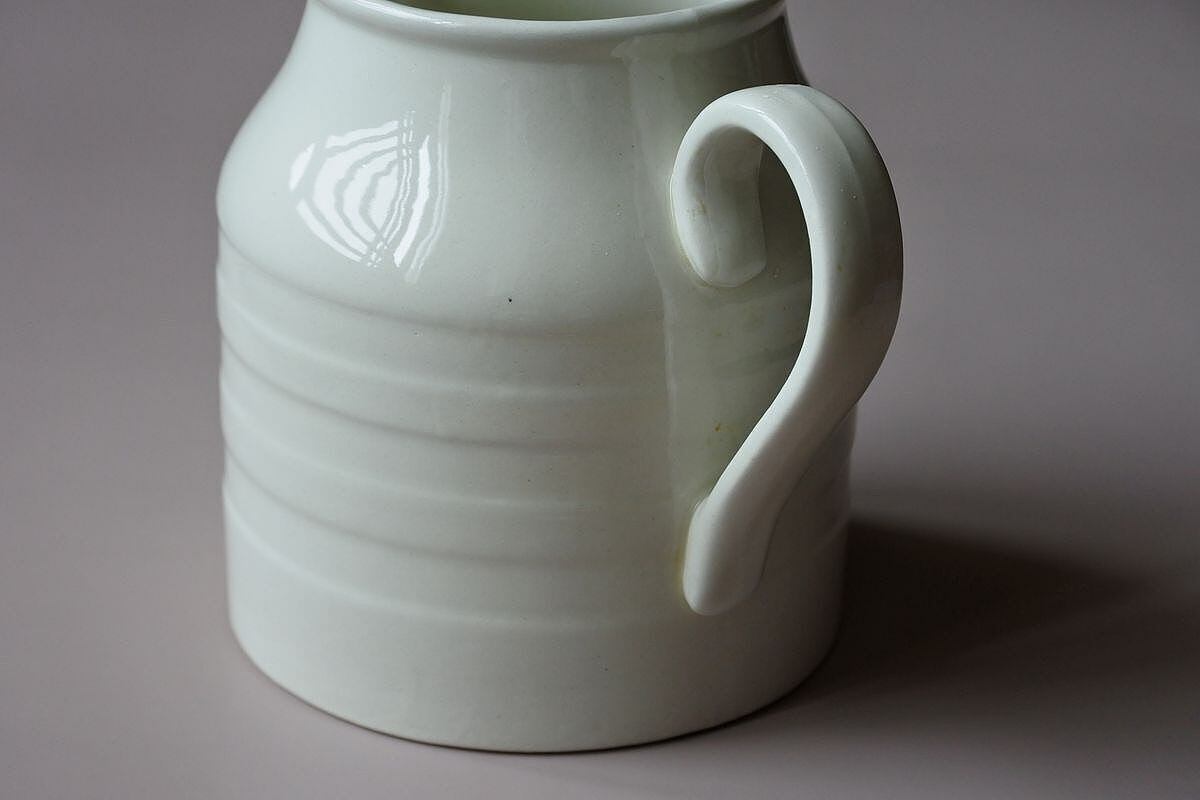 シンプルながらデザイン性を感じさせるフォルム。陶器のやわらかさを残した半磁器のジャグ。Spparow Beak(スズメのくちばし)と呼ばれる注ぎ口とボディの縞模様は、今も好まれる定番パターンです。1950年頃のヴィンテージ品が主流ですが、少し時代の古い1900年代初期の品。ロンドンのアンティーク店に年代別に数点並べてあった中から選んで仕入れました。肌合いや質感にしっとりした落ち着きがあります。オブジェとしてディスプレイしても楽しめめますが、大きなサイズで花生けに良さそうな佇まい。紫陽花やバラなどふわりとした大輪の花を引き立ててくれそうです。