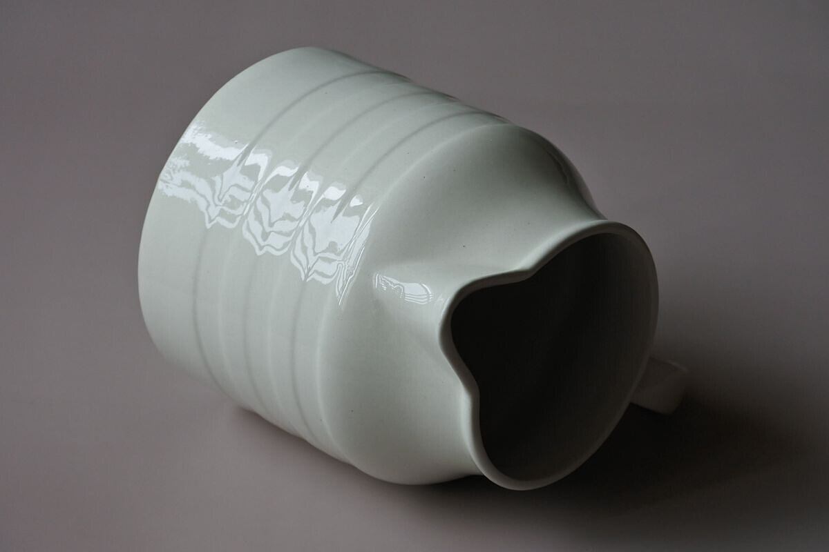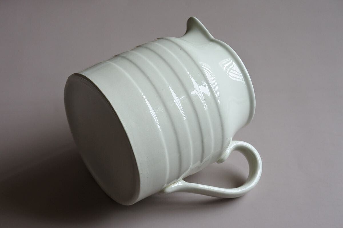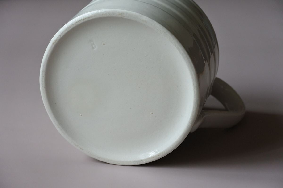 大きな欠けやひびなし。水漏れなどなし。表面に黒点や穴あき(窯焼きの際に生じたと思われる)あり。ハンドル部分内側に小さな色付きあり。ざらつきあり。無傷ではありませんが、ほとんど使用感のないきれいな品です。色味はオフ白。明るいところでは白みがやや強く見えます。