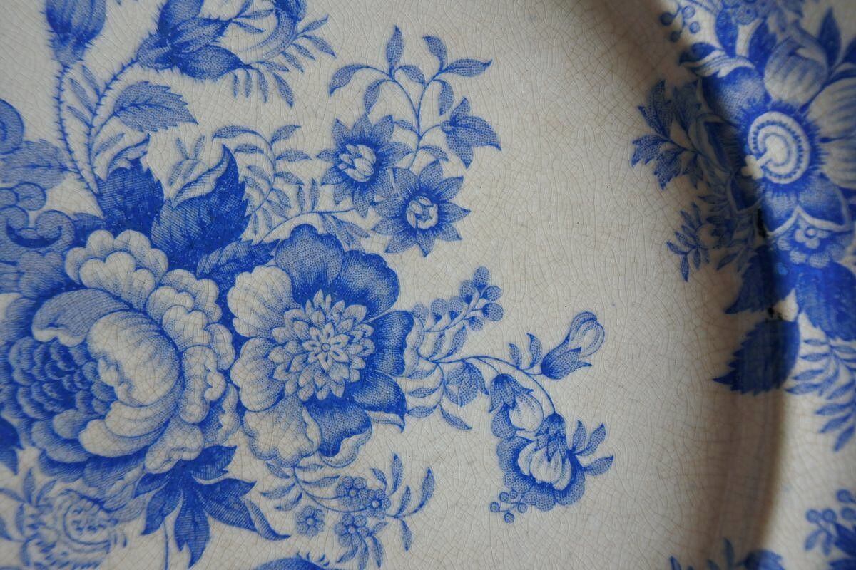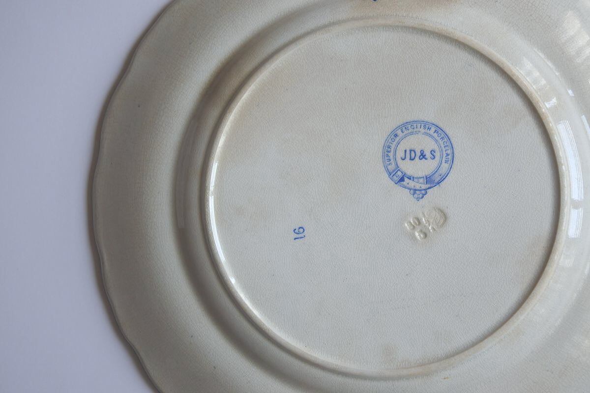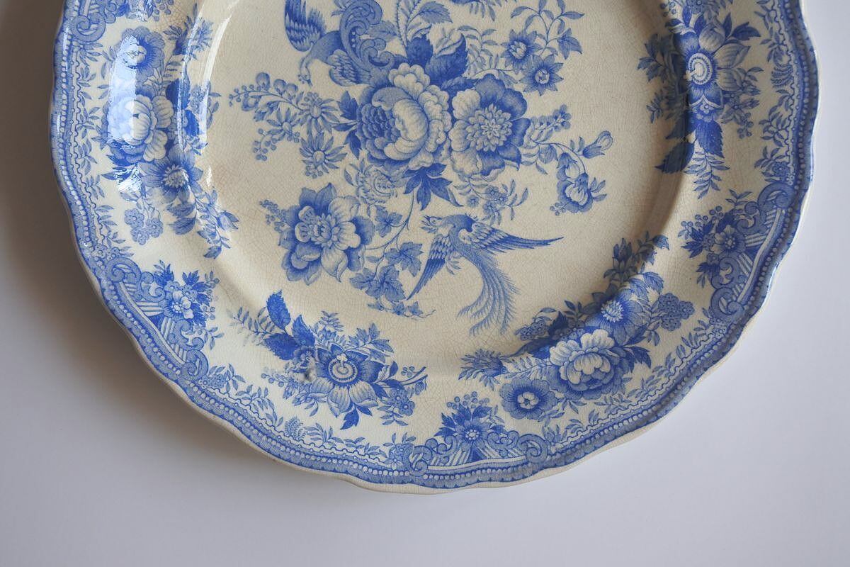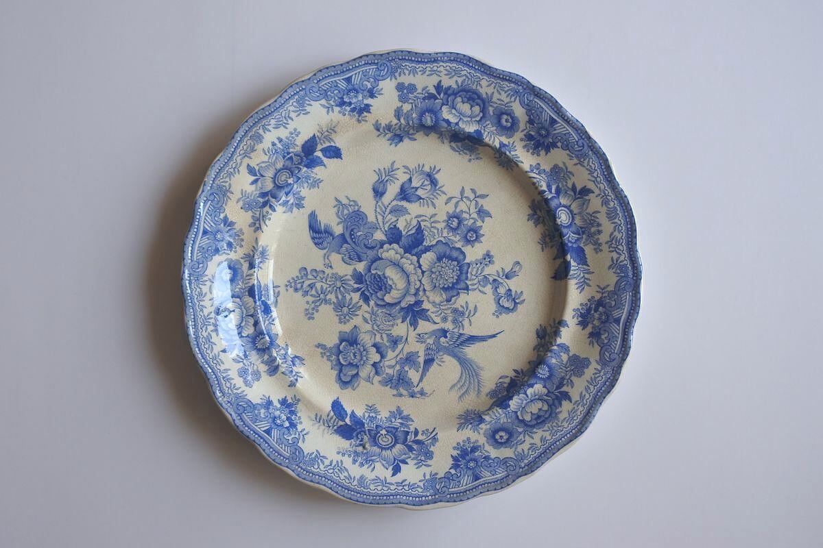 ブルーの色合いが涼し気なヴィクトリア時代のリム皿。花や鳥が描かれたポエティックな絵柄が印象的です。Asiatic Pheasants(アジアティック フェザンツ)と呼ばれるオリエンタルな趣の定番柄で、花はピオニー、鳥はキジがモチーフと言われています。転写プリント装飾は18世紀半ばにイギリスで開発され、19世紀にかけて高い人気を得ました。手描きに比べると単調ですが、皿いっぱいに描かれた絵柄をより軽やかに、繊細に見せる効果に長けているように思います。主要産地Staffordshire(スタッフォードシャー)にあった工房(JD&Co.)で19世紀終わり頃に焼かれた品。しっかりした厚みと重みがあり、色合いに落ち着きが感じられます。所々薄っすら貫入や色付きが見られ程よく枯れた味わい。フルーツや焼き菓子をのせて、古い時代のふわりとした甘美さをカジュアルに楽しまれてみてはいかがでしょうか。