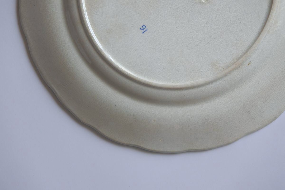 転写のズレ、滲み、色とびなどあり。全体に細かな貫入、色付きが見られます。リムの縁に微かに剥がれのように見える箇所あり。リム内側に小さな黒い汚れあり(目立ちません)。裏側に目跡あり。写真をご参考になさってください。色味はオフ白。絵柄はコバルトブルーに近いです。艶あり。使用感はほとんどありません。古いものの味わいを楽しんでくださる方におすすめします。