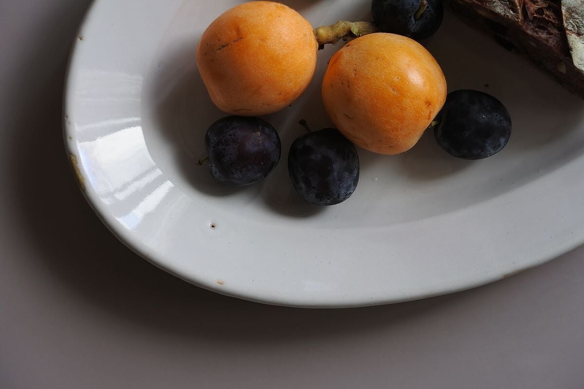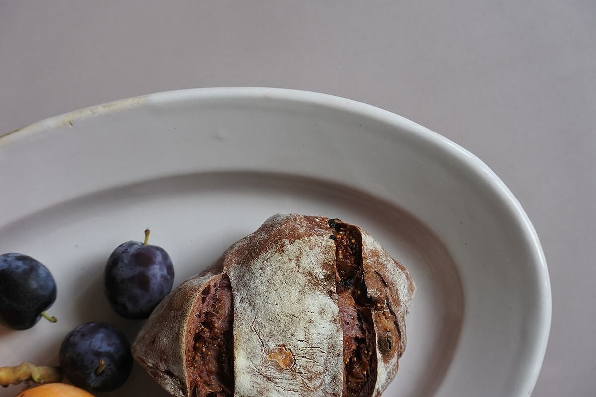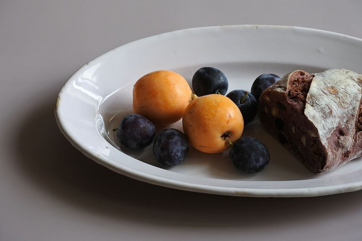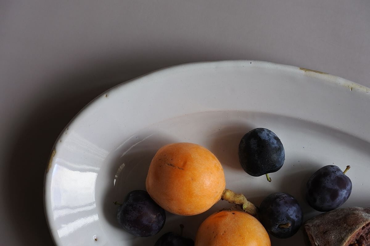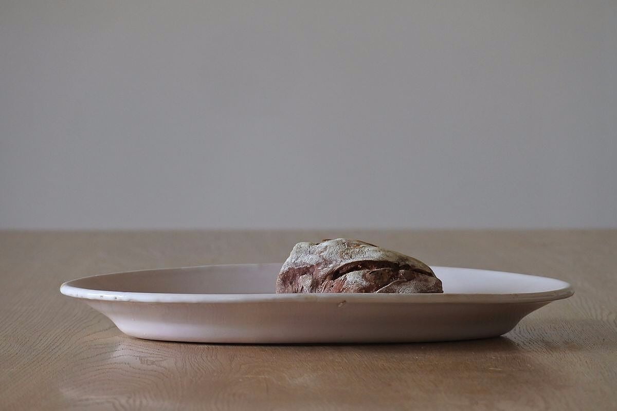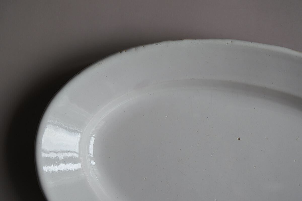 シンプルなフォルムの白釉オーバル皿。写真ではわかりづらいのですが、光の当たり具合で薄っすらピンクベージュに色付いて見えます。艶のあるしっとりした質感や、指で弾いた時の金属音などから、19世紀頃、フランス南西部マルトル・トロザーヌ(Martres Tolosane)辺りで焼かれた、ムスティエなどと同質のファイアンス皿ではないかとのこと。大皿の類に入りますが、縦幅が狭くほっそりしておりミディアムなサイズ感。厚みのあるとろりとしたやわらかさを感じさせつつ、スリムな印象です。欠けや染みの色付きなどは見られないものの、釉薬が素地に馴染み、肌合いに枯淡な趣があるのも魅力的。のせるものの自然な色合いをそっと引き立ててくれそうです。