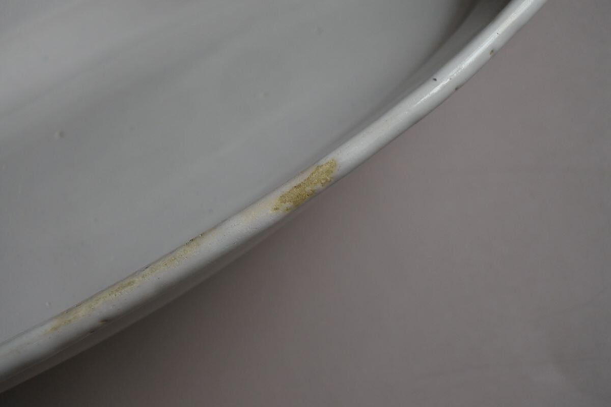 欠けやひびなし。全体に釉薬のムラあり。窯焼きの際に出来たと思われる小さな穴や黒点あり。見込み部分にカトラリー痕が少し見られます。リムの縁に釉薬のかけられていない箇所あり(剥がれのように見えます)。裏面リムに3箇所目跡(器を重ねて焼いた際の跡)あり。底に擦れあり。僅かにガタつきあり。基本の色味は白ですが、光の当たり具合で薄いピンクベージュに色付いて見えます。暗い場所ではピンクベージュの色合いが濃くなります。艶あり。無傷ではないものの、大きなダメージのない品です。