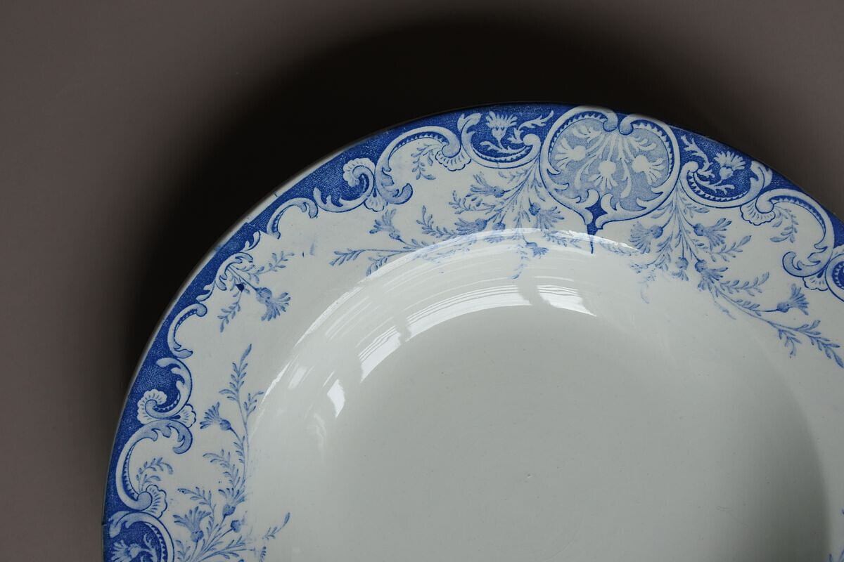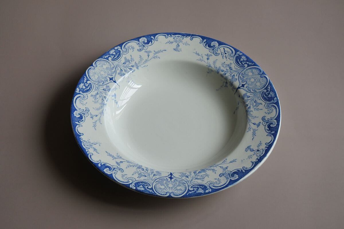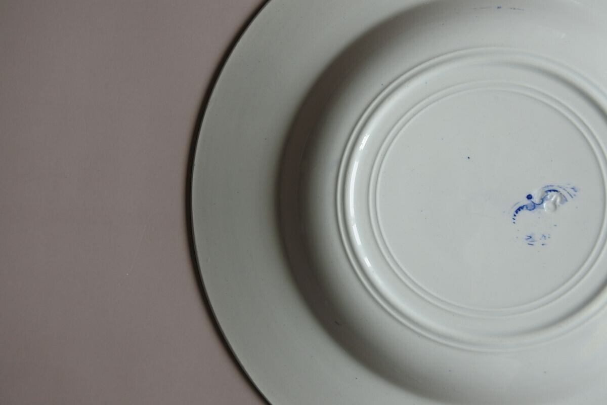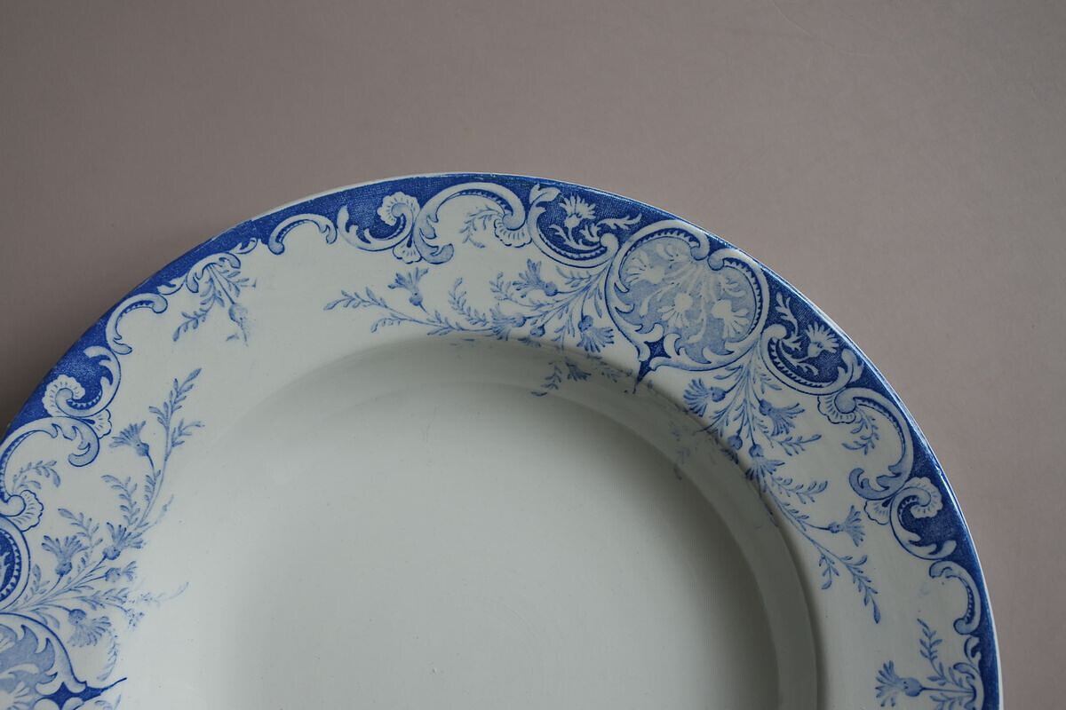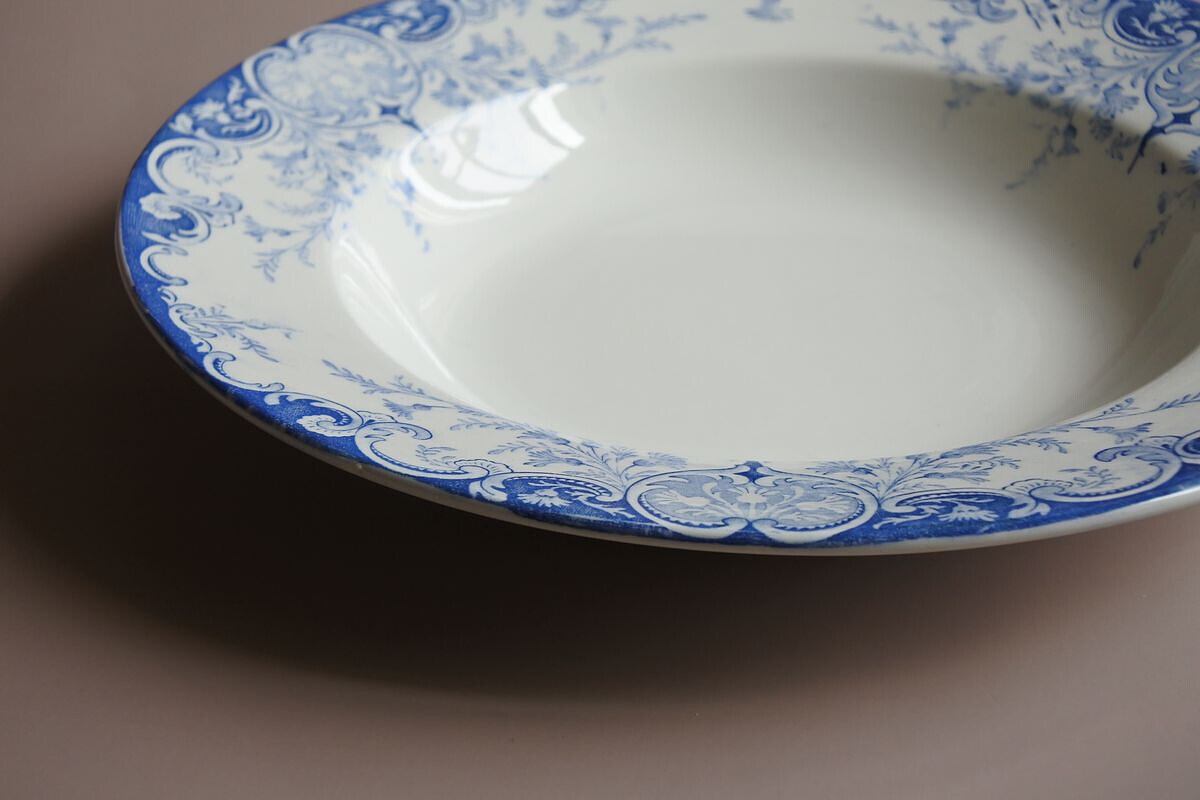 インディゴブルーのグラデーションが、軽やかで涼し気な印象の深皿。フランス北東部ロレーヌ地方にあったLuneville(リュネヴィル)窯の1900年頃の品です。リムを縁取る転写柄が、翼を広げた不死鳥のように見えるデザインからか、Phénix(フランス語でフェニックス)というシリーズ名が付けられています。ハートのモチーフのようにも見え、ふわっと広がる野あざみの絵柄に、フェミニンな華やかさも感じます。ニュアンスのあるブルーの色合いが、フルーツやお料理、デザートなど、盛り付けるものの色味を引き立ててくれそうです。