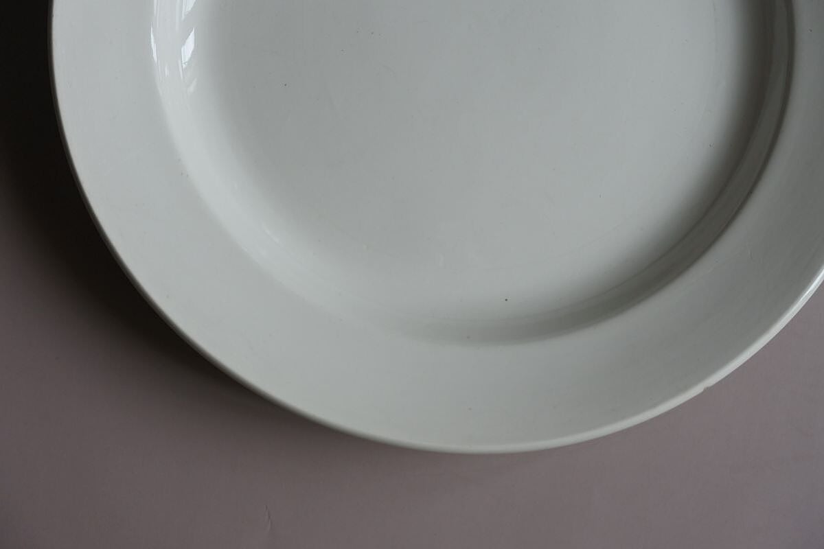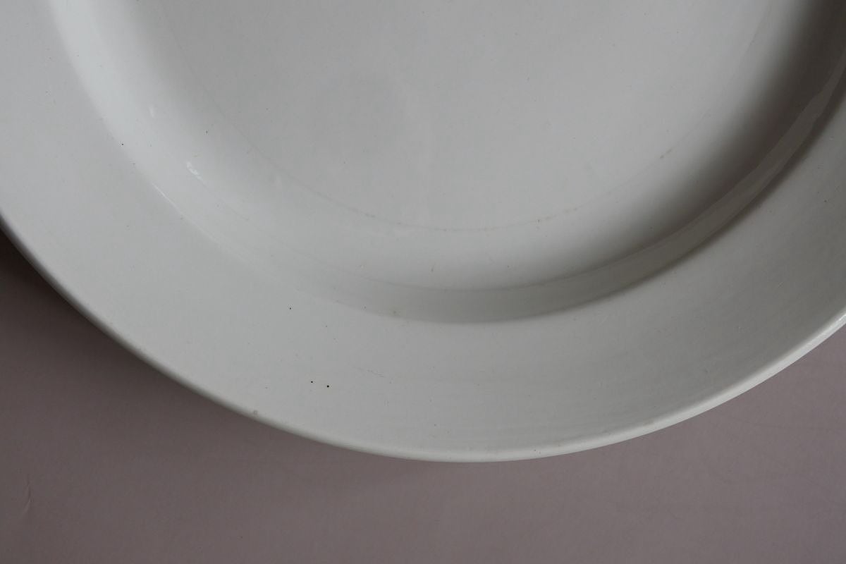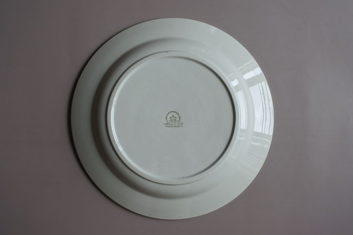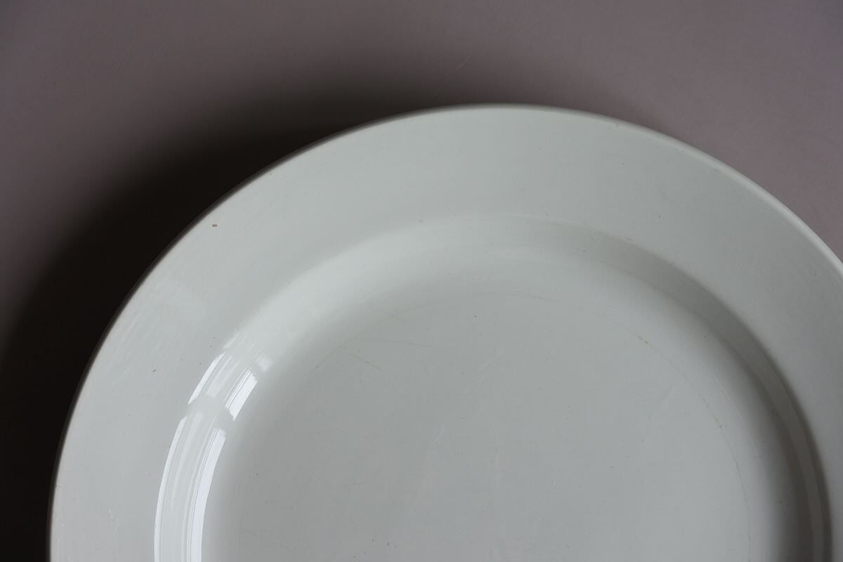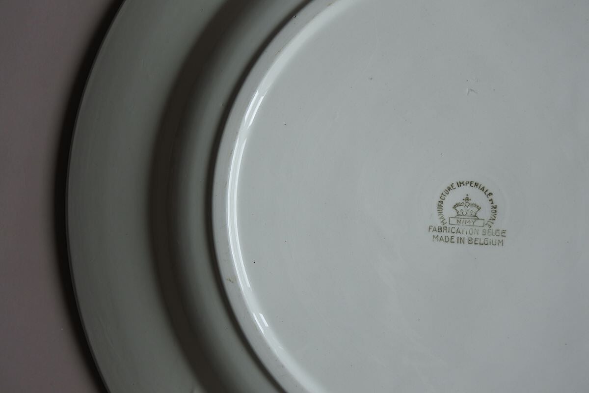 ふっくらした厚みのある丸皿。まんべんなく塗り重ねたような白釉の質感が、やわらかな温かみを感じさせます。NIMY(ニミー)の窯印がある1900年代初め頃の品。NIMYはBOCH(ボッホ)窯同様、王室の承認を得た名窯のひとつ。18世紀終わり頃に創業し20世紀半ばに閉業するまで、ベルギーを代表する陶磁器メーカーとして親しまれました。大皿の部類ですが、リムに立ち上がりがあり、少し深さがあるため程良くスマートな印象。しっとりした肌合いや手にした時の重みなど、古い時代の陶器ならではの味わいを楽しみながら、普段のテーブルで気軽にお使いいただけそうなシンプルな品です。