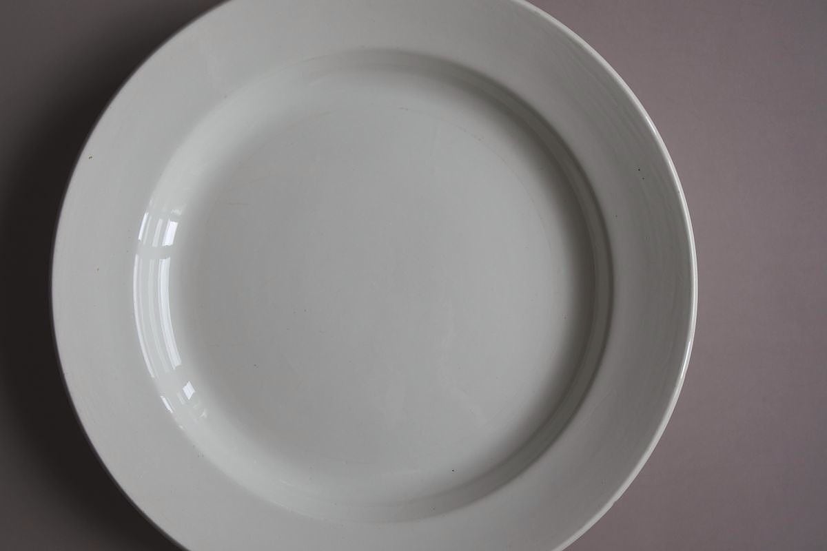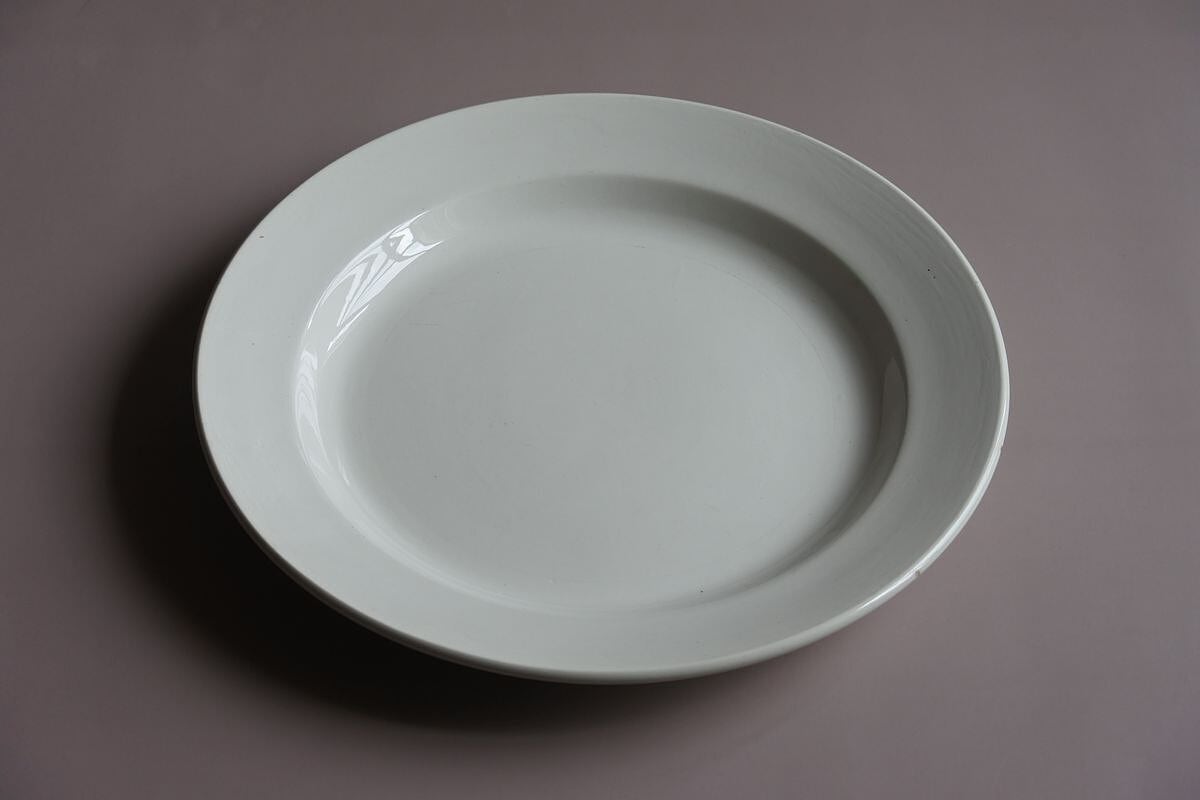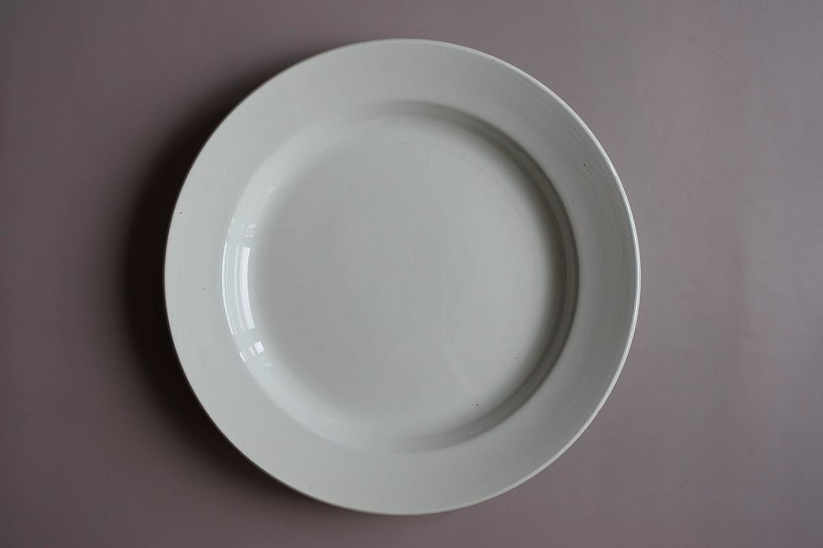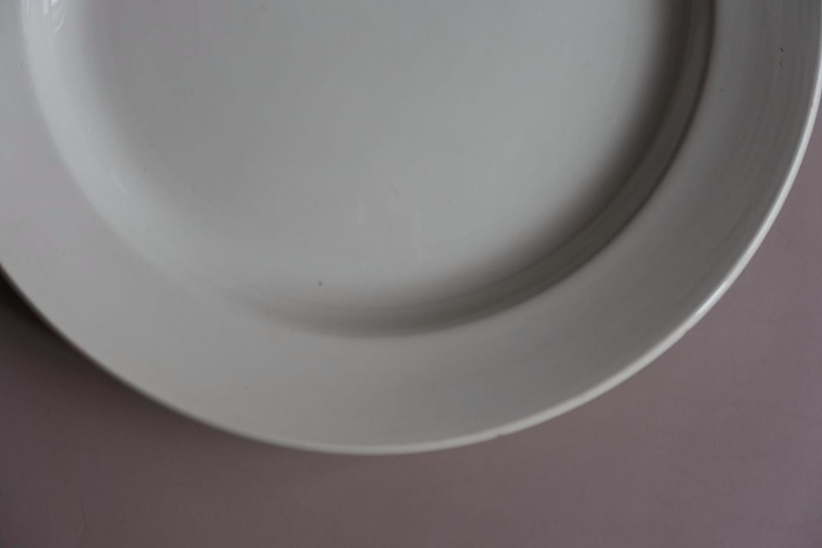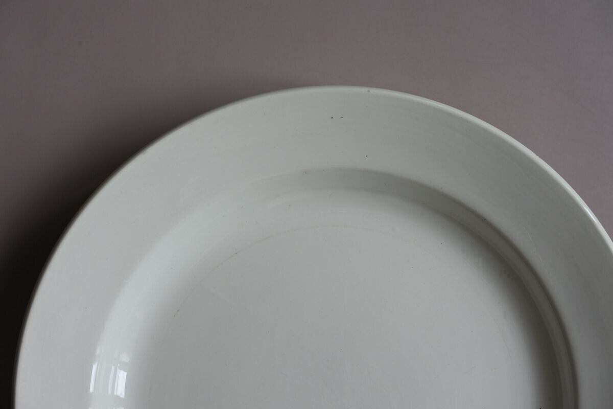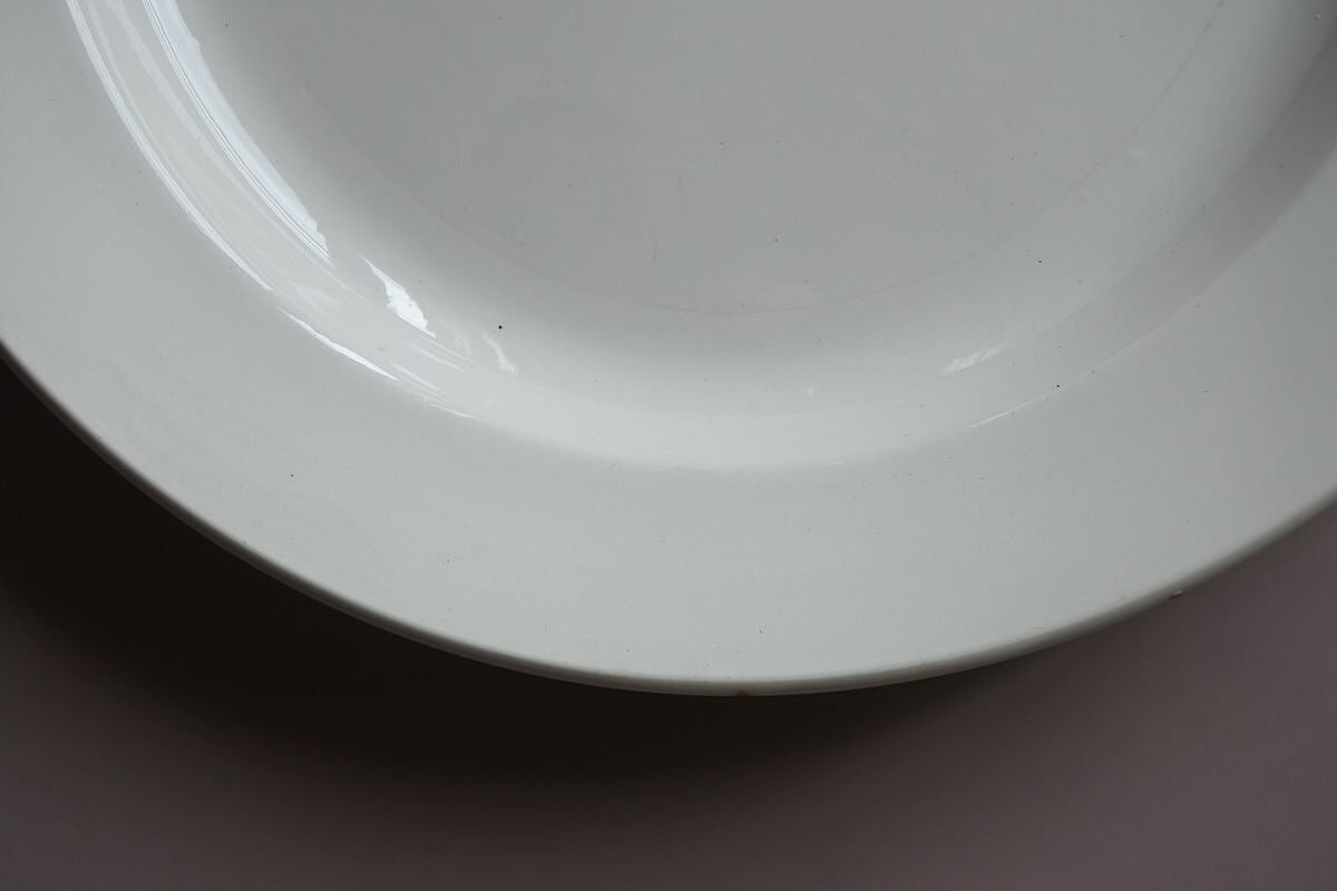 ふっくらした厚みのある丸皿。まんべんなく塗り重ねたような白釉の質感が、やわらかな温かみを感じさせます。NIMY(ニミー)の窯印がある1900年代初め頃の品。NIMYはBOCH(ボッホ)窯同様、王室の承認を得た名窯のひとつ。18世紀終わり頃に創業し20世紀半ばに閉業するまで、ベルギーを代表する陶磁器メーカーとして親しまれました。大皿の部類ですが、リムに立ち上がりがあり、少し深さがあるため程良くスマートな印象。しっとりした肌合いや手にした時の重みなど、古い時代の陶器ならではの味わいを楽しみながら、普段のテーブルで気軽にお使いいただけそうなシンプルな品です。