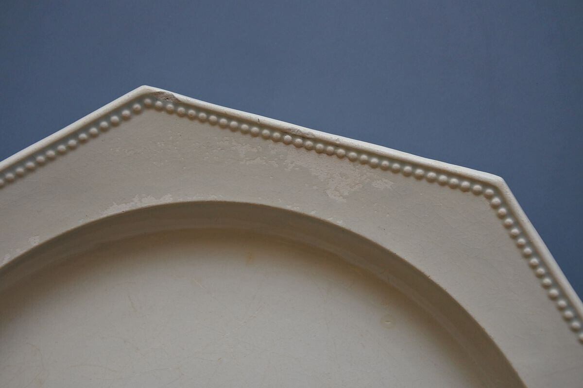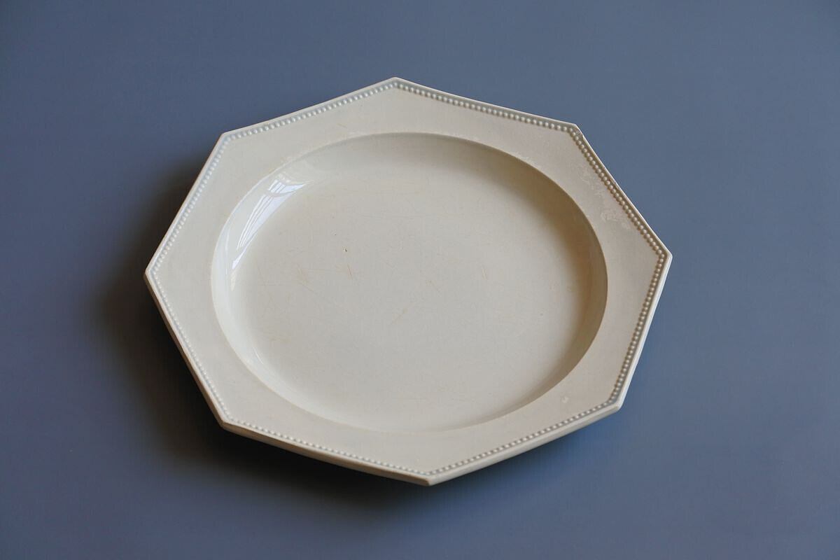 釉薬の剥がれやカトラリー痕など、古寂びた表情が味わい深いオクトゴナル平皿。Choisy Le Roi(ショワジー ル ロワ)窯の創設者Paillart兄弟の名前が刻まれた19世紀初期の品です。マットな艶めきのある肌合いや、彫塑のようなフォルムが魅力的な、ファイアンスフィーヌと呼ばれる古陶。リムを縁取る繊細なパール柄と傷みとのコントラストが、情緒的で儚げな雰囲気を漂わせています。枯れた味わいがお好きなかたにおすすめ。ケーキやフルーツ、パンなどのせたり、キャンドルグラスをのせたりして、閑寂な佇まいを楽しまれるのもいいかもしれません。さり気なく絵になる一枚です。